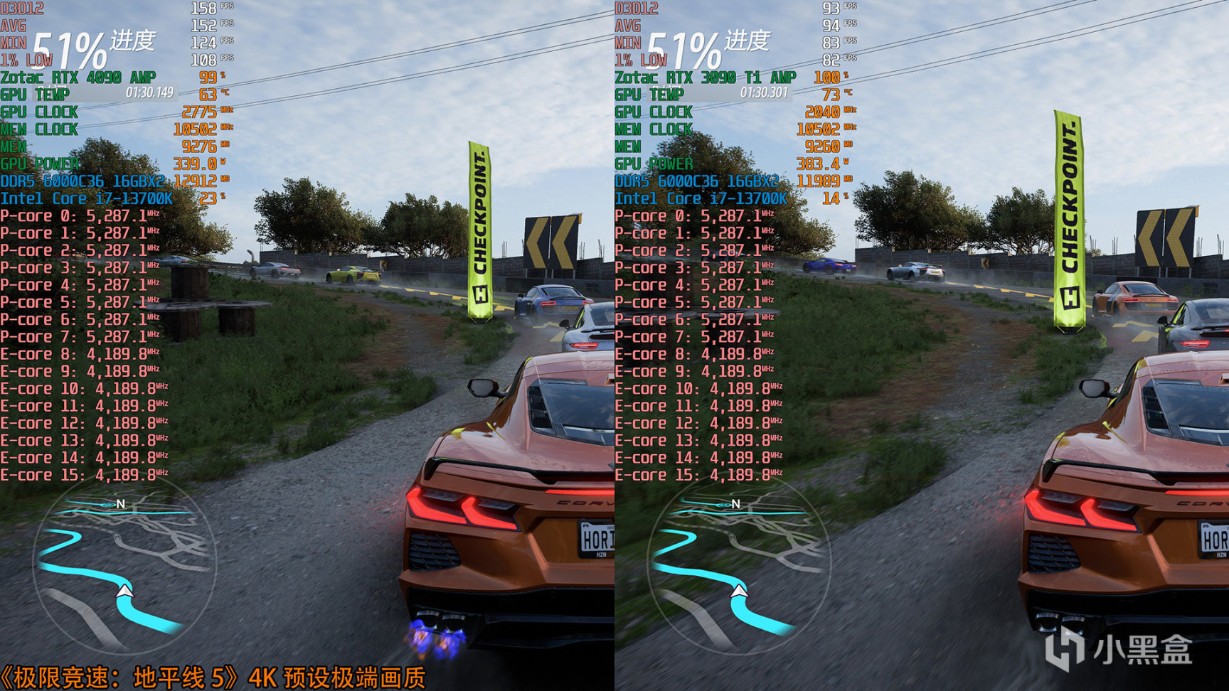 《极限竞速:地平线5》4K预设极端画质,RTX 4090 AMP平均帧数为152fps,RTX 3090 Ti AMP平均帧数为94fps,提升达到了62%