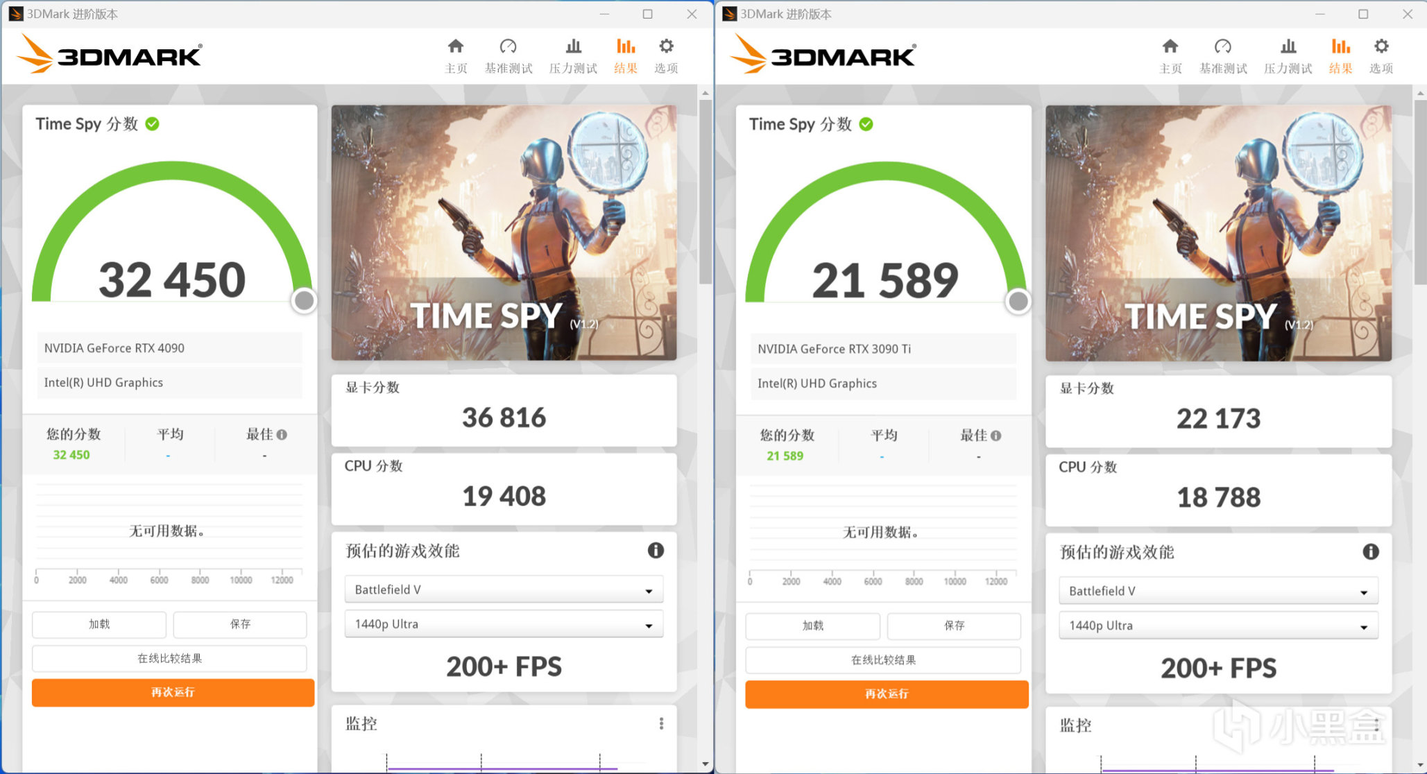 3DMark Time Spy项目,RTX 4090 AMP显卡分数为36816,RTX 3090 Ti AMP显卡分数为22173,提升66%