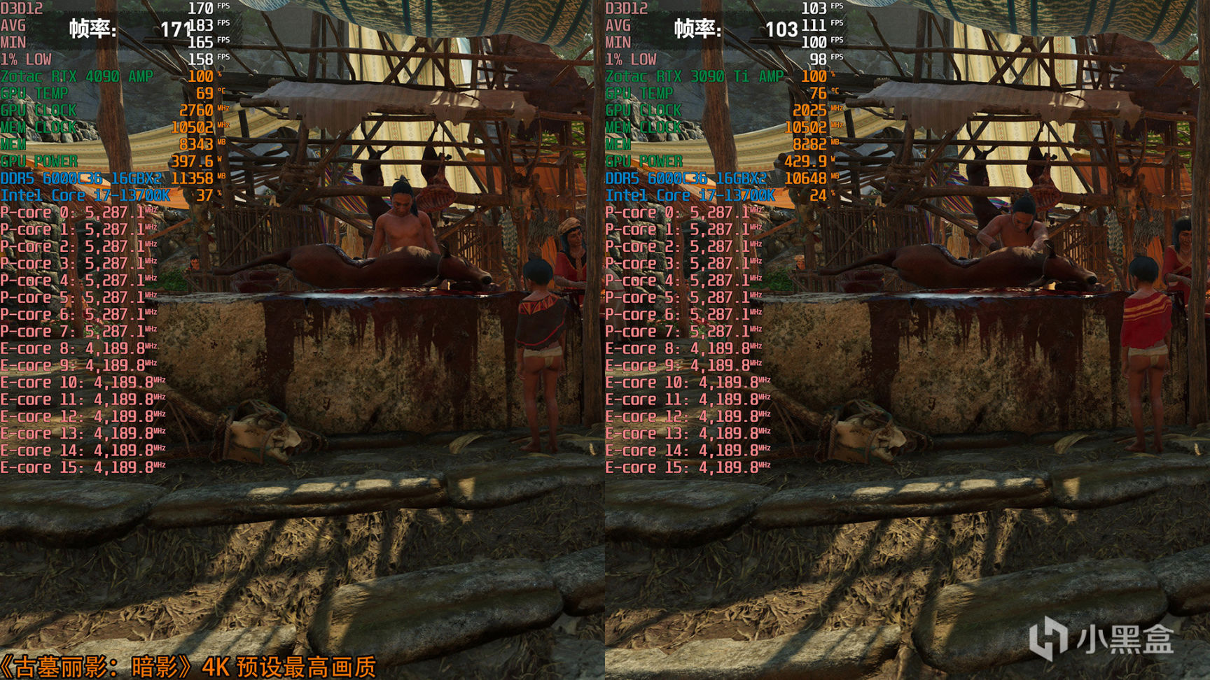 《古墓丽影:暗影》4K预设非常高画质,RTX 4090 AMP平均帧数为183fps,RTX 3090 Ti AMP平均帧数为111fps,提升达到了65%