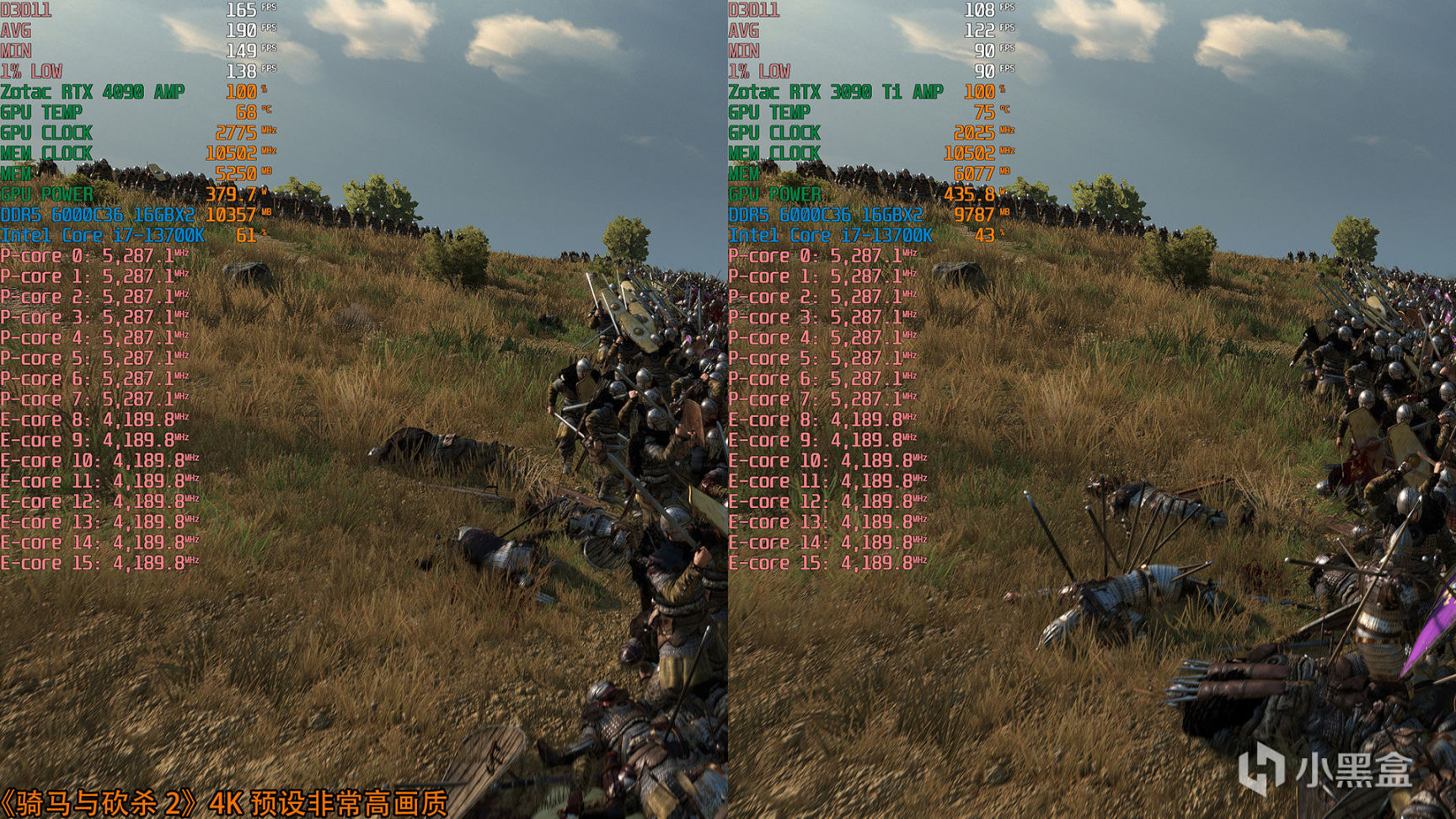 《骑马与砍杀2》4K预设非常高画质,RTX 4090 AMP平均帧数为190fps,RTX 3090 Ti AMP平均帧数为122fps,提升达到了56%