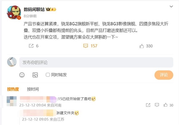 博主數碼閒聊站暗示,小米15、小米15 Pro已經開案立項,其中小米15 Pro有可能會配備潛望長焦鏡頭,目前小米團隊正在評估中。