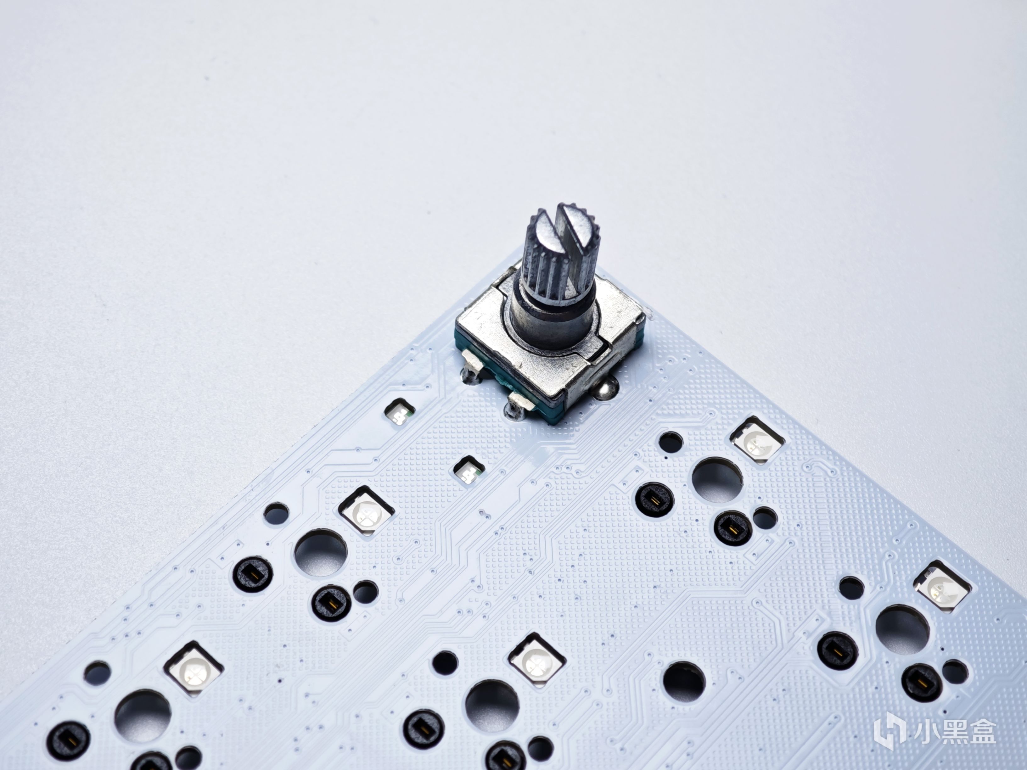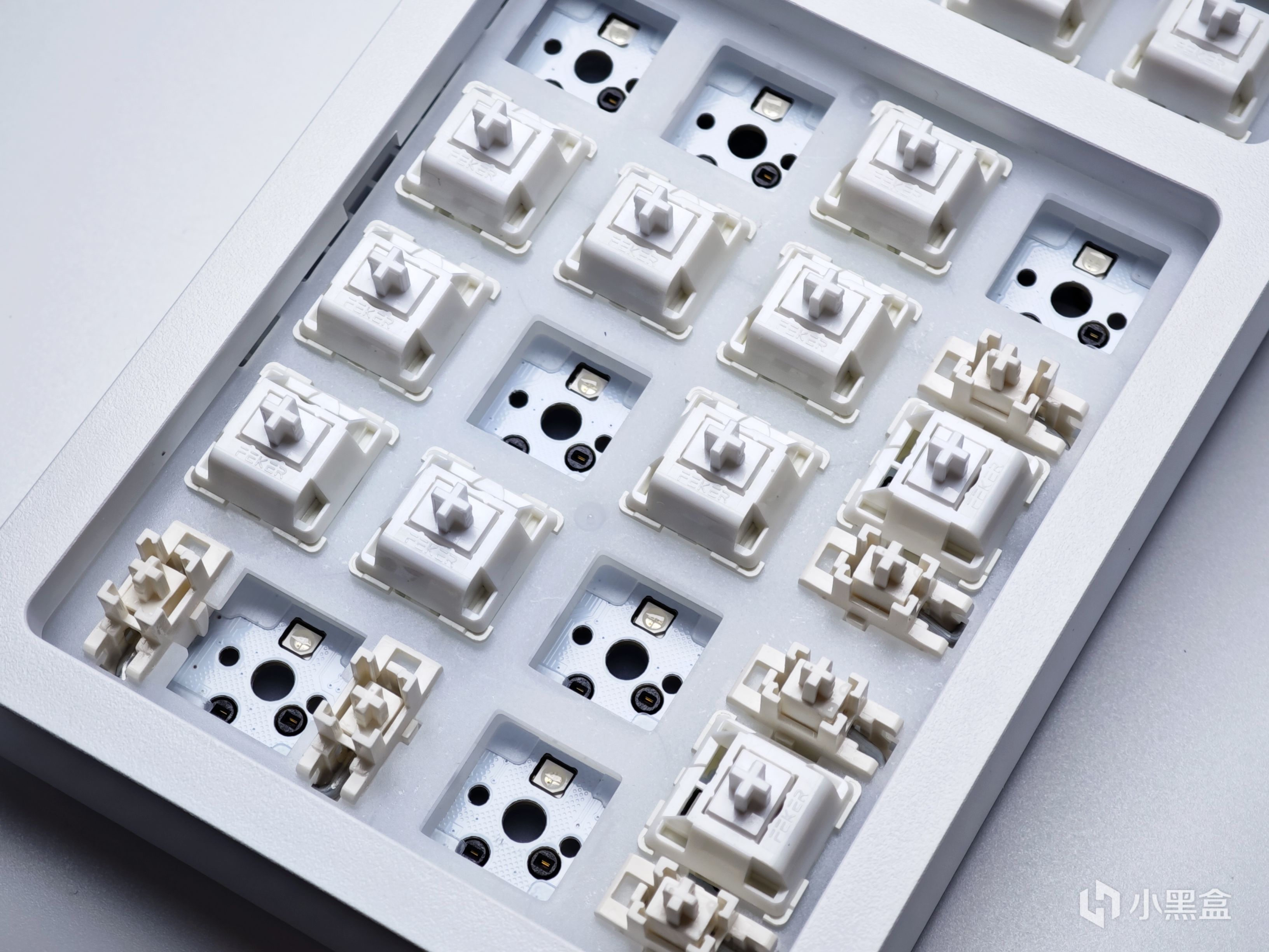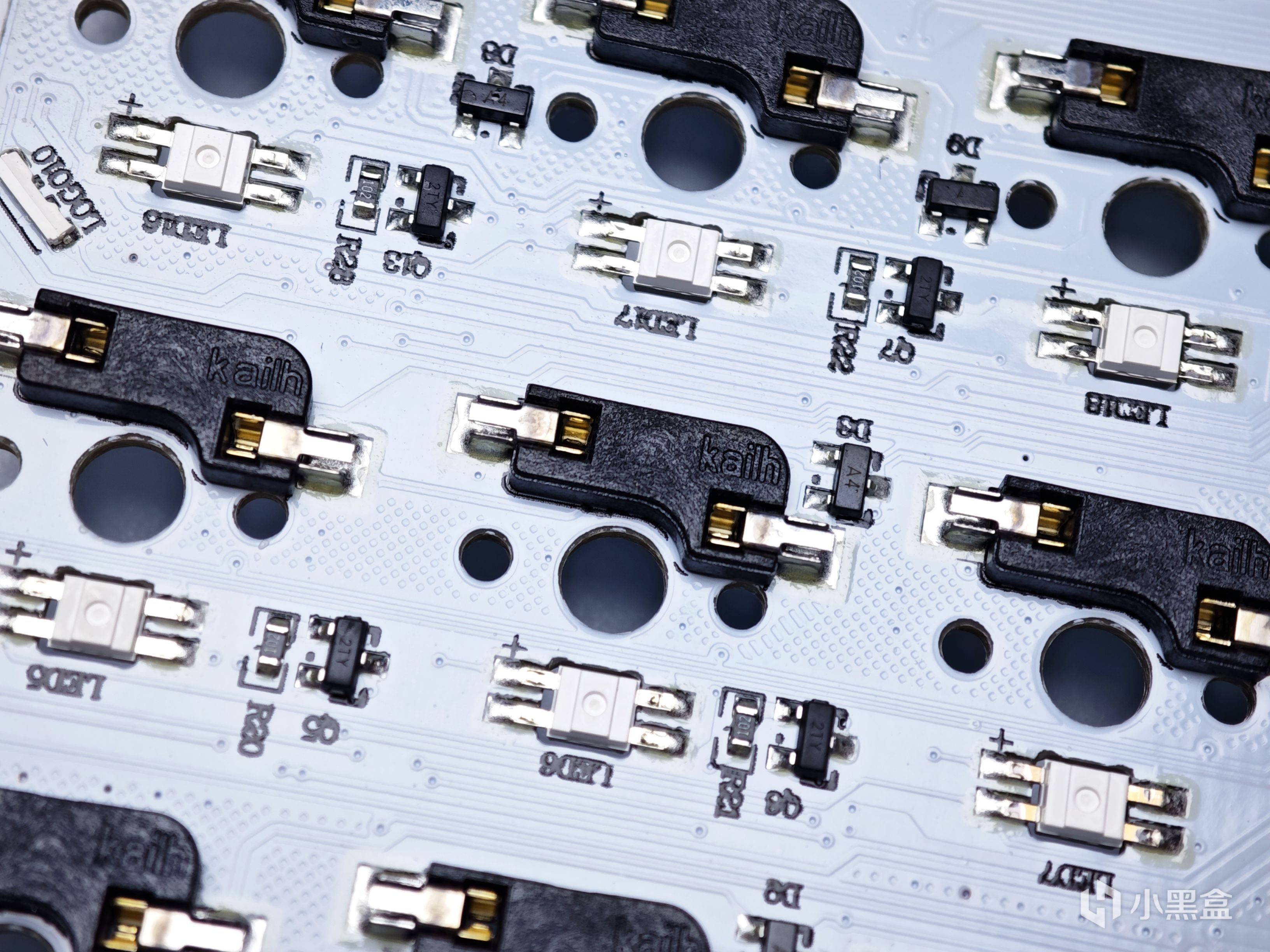 PCB方面同样没有采用开槽,但热插拔没少,采用的是轴座热插拔,支持三脚/五脚的机械轴体热插拔,轴座品牌为凯华。同时可以看到采用的是上灯位的灯位设计,搭配正刻字透键帽的亮度会更好。