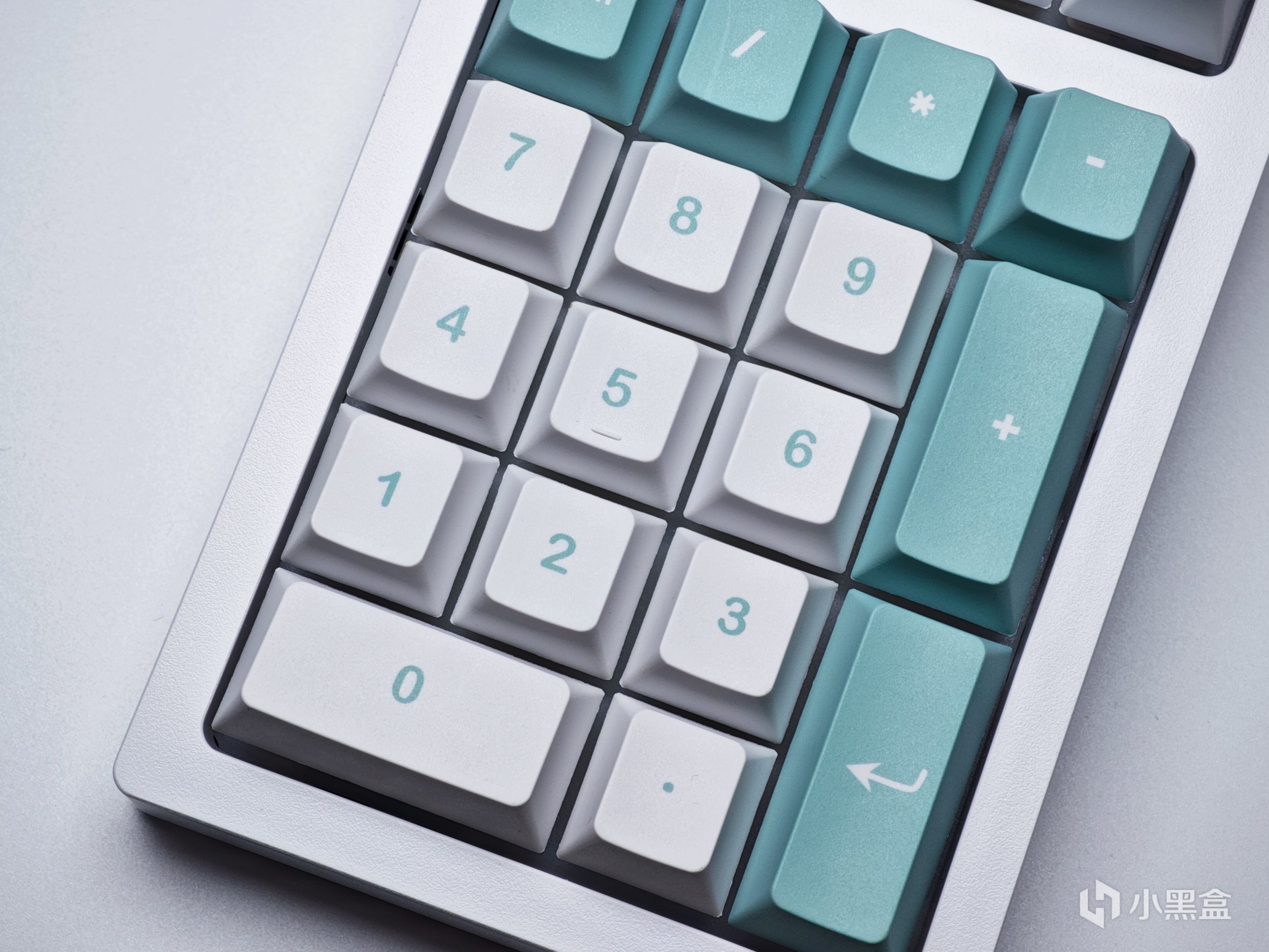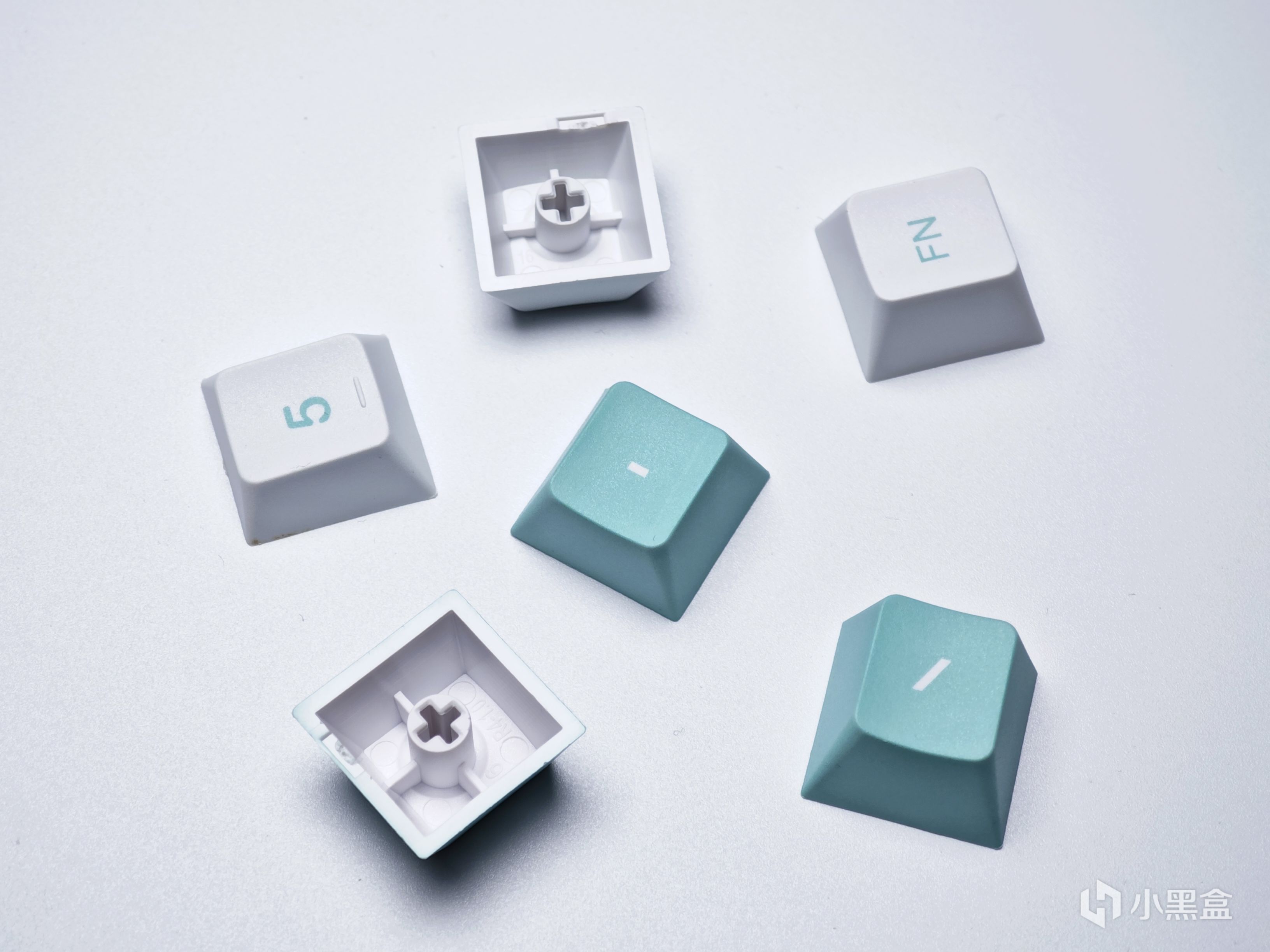 键帽方面我刚拿到手以为是双色注塑,毕竟这套键帽本身也确实没太多花里胡哨的地方,但拔下来过后才发现是热升华的。白色部分不清楚是偷懒用单面热升华工艺还是五面了,青色部分的键帽是采用的五面热升华,所以材质不用多说用的是PBT材质,高度方面则是原厂。
