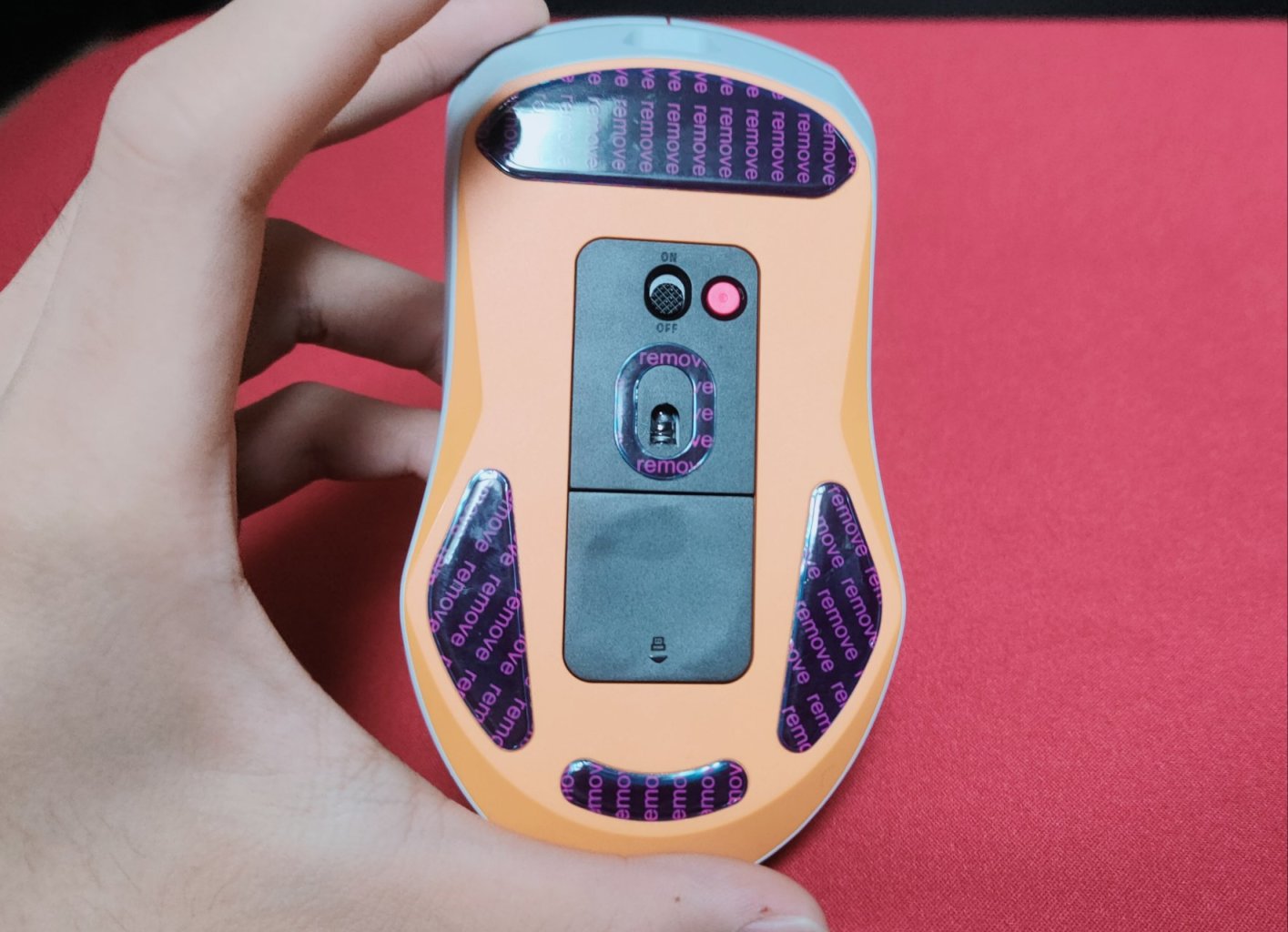 底部佈局簡潔,可以貼上贈送的特氟龍腳貼提升順滑度,傳感器方面採用了中置佈局,上方兩個按鈕分別爲電源開關(黑色)以及自定義按鈕(紅色),默認更改DPI鍵,後續可以改爲其他的,並且因爲在底部可以防誤觸。下方的正方形處爲鼠標的2.4G收納倉,如果同時鼠標支持無線充的功能,購買雷柏的P3充電模塊就可以使用了。