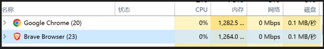 如图,我 windows 电脑上的 Brave 相比 Chrome 多了个后台插件,虽然进程数多,但内存占用却和后者差不多甚至还轻。
