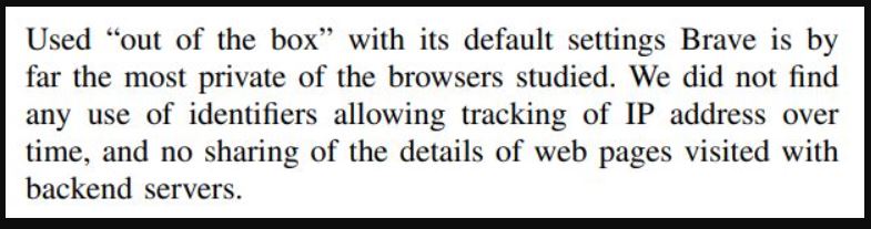 “在没有使用任何自定义的默认设置下,Brave 浏览器是研究中最具隐私性的浏览器。我们并未发现任何使用标识符来跟踪IP地址的行为,也没有发现它将访问的网页详细信息与后端服务器分享。”