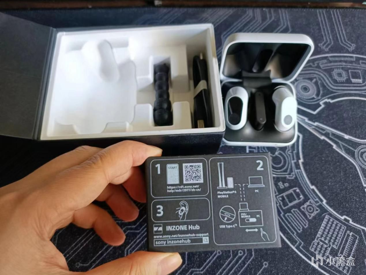 盒子里的内包装盒和我的H7风格一样,都是一个黑箱,里面包含的内容物(除保修卡说明书以外)同上:耳机×1、接收器×1、USB连接线×1。我之前吐槽过H7为啥没有替换耳罩、其他DIY小配件之类的道具,那么INZONE Buds还是有点进步,那就是多了一串备用的耳机帽,方便各种耳廓大小的玩家替换。
