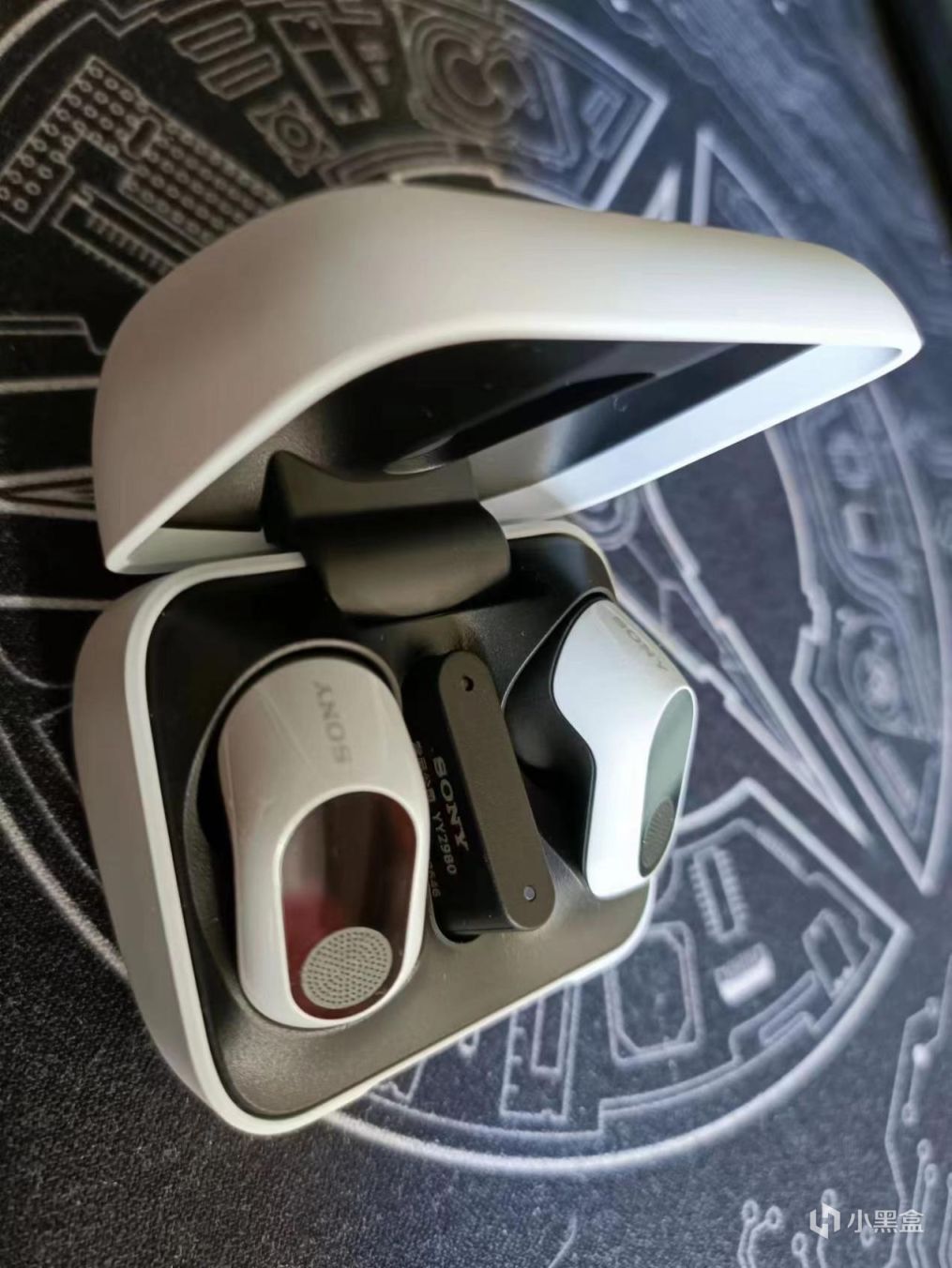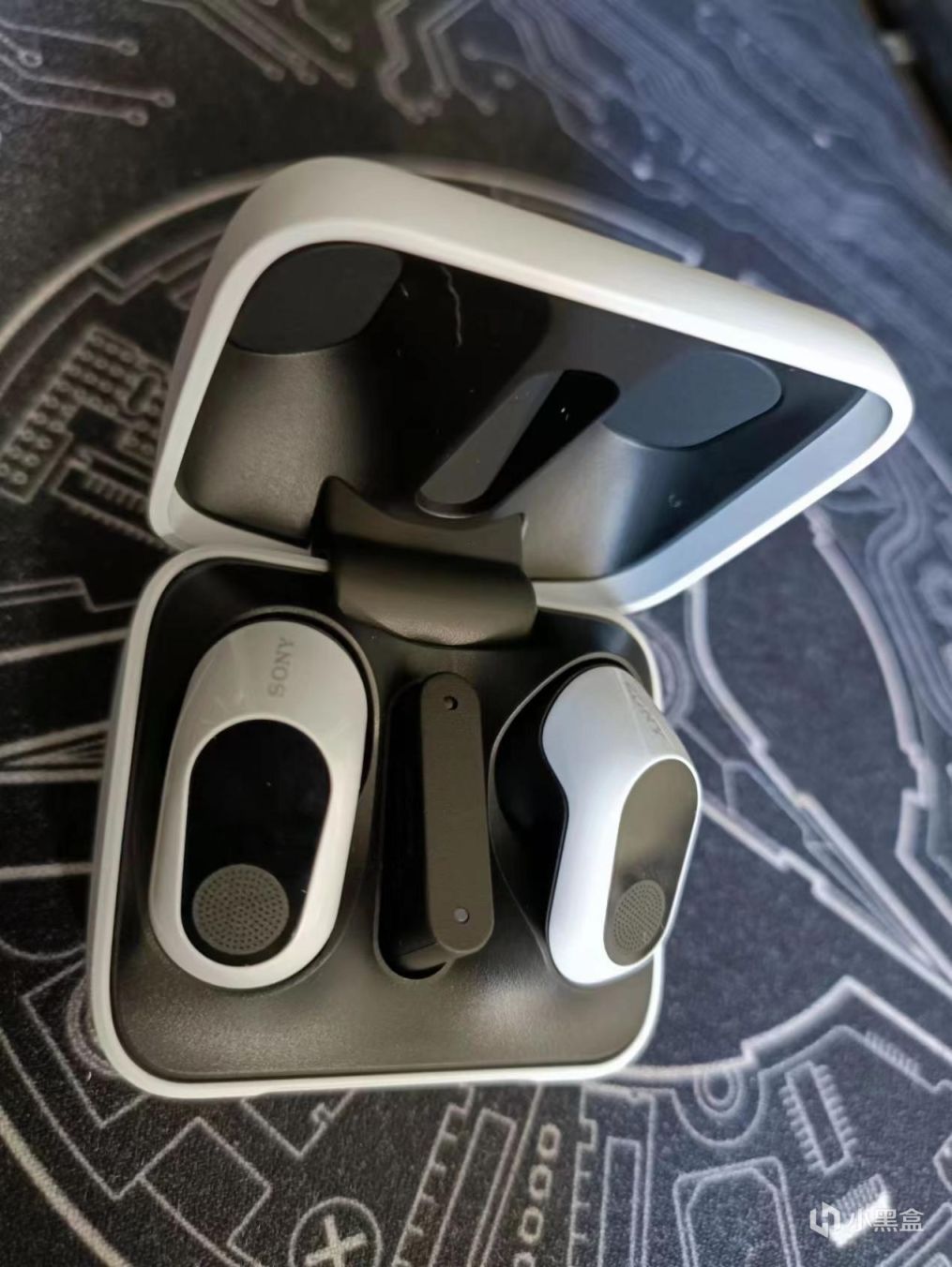 耳机收纳&充电盒的话,INZONE Buds不同于一般类似产品是个椭圆的蛋,而是有点像个戒指盒,其中包含的内容,除了一对耳机还有一个专门的接收器位置。来,看看帅气的定妆照!