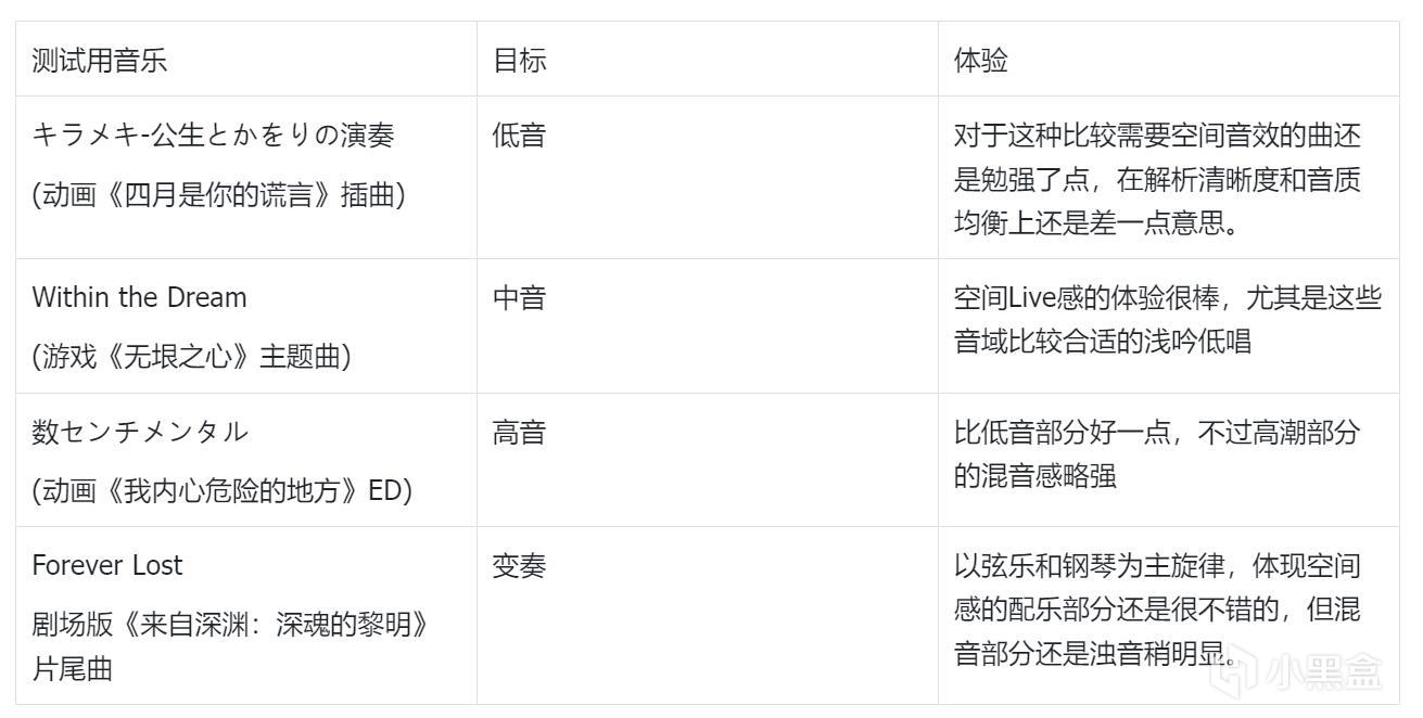在音乐体验部分,如果直接说结论的话,那就是比森海塞尔momentum这样的差了些,毕竟术业有专攻嘛,不过主要体现在中低音音域的三频还原、解析清晰、音质均衡上,在那些live类型的音乐,或者偏中高音、重鼓点节奏感的音乐而言,体验还是相当不错的,大概是因为比较好的还原了空间临场感。此外就像上一段提到的,游戏配乐大多体验不错。