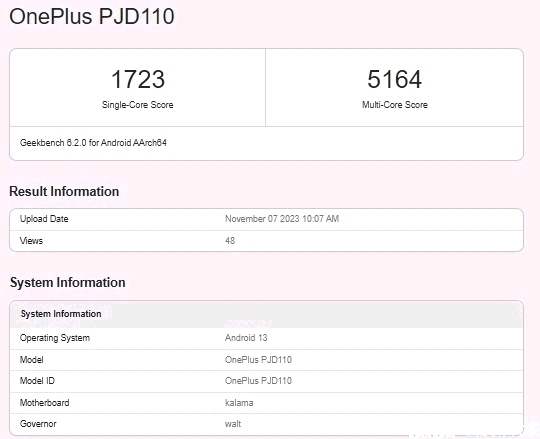 一加 Ace 3 此前已(型号:PJD110)现身 Geekbench6.2.0 跑分平台。