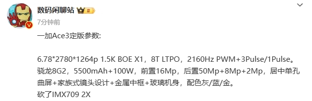 12 月 13 日消息,据数码博主 数码闲聊站 爆料,一加 Ace 3 量产配置现已定版。