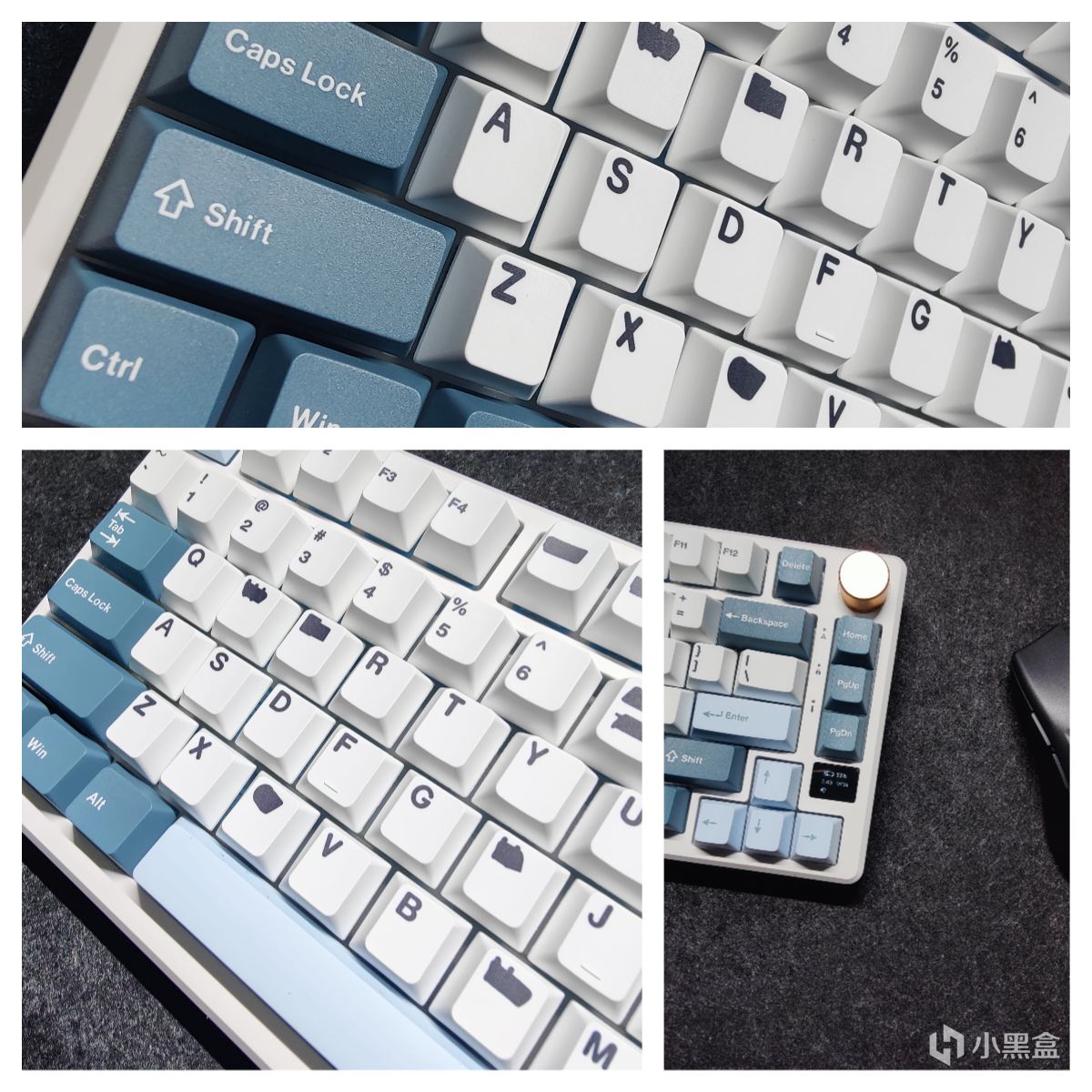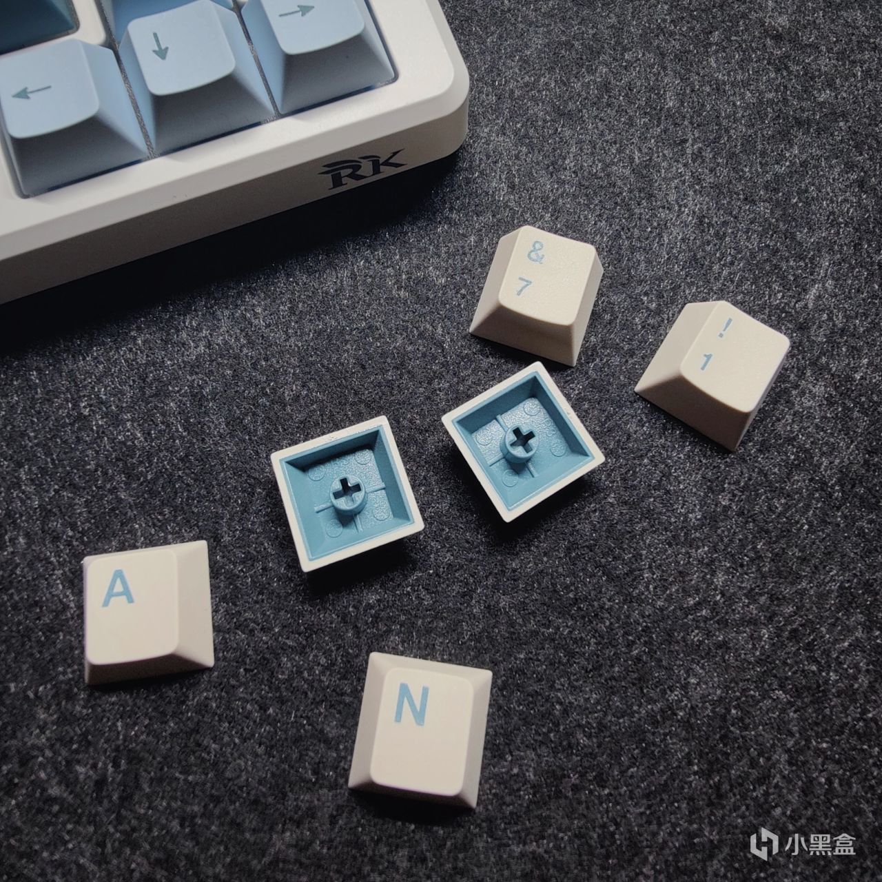 过程中也想过,保留浅蓝色的空格按键和回车,肉眼看着效果还不错,不过考虑到一整套键帽打油程度会因此产生差异,我最终还是决定全部替换。