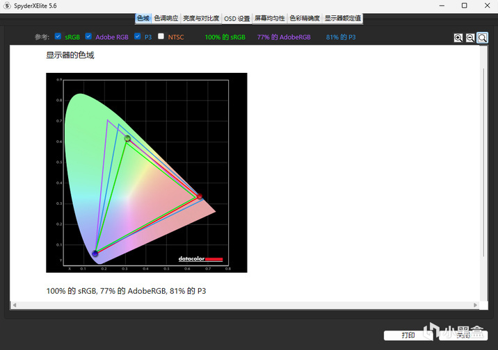 通过红蜘蛛检测,检测出来100%sRGB以及94%AdobeRGB和宣传的是一样的,甚至在sRGB方面甚至还超过了宣传说的,能达到了100%