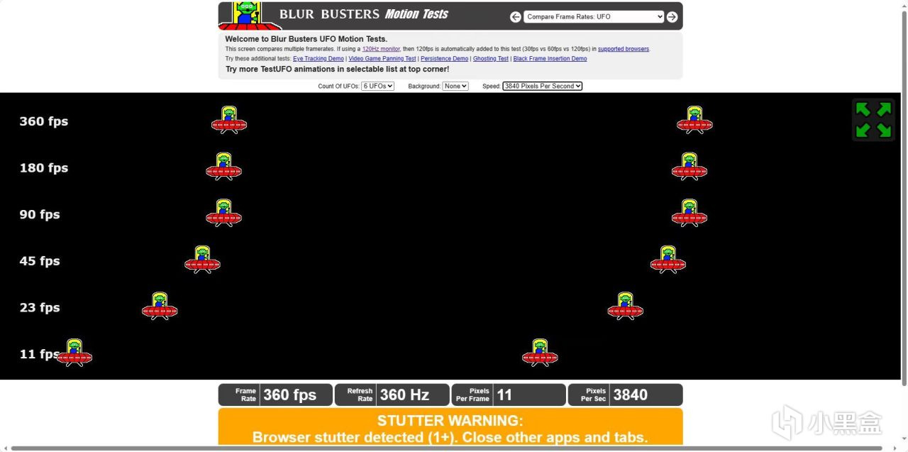 在显示器刷新方面,我们可以打开UFO看一下,刷新率,在速率低的时候可以其实其中的差别不大,但是在高速率的时候可以明显的看见刷新率的差距,高刷新率的屏幕可以让用户在游戏过程中,更早一点点的发现敌人的身影,这也导致了为啥我现在有点用不惯低刷新的屏幕的原因。。。。