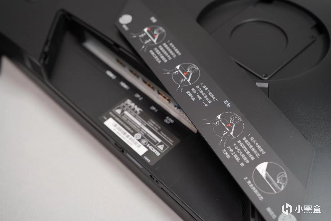 支架连接方式上面这里,通过4条卡扣的方式连接,安装是非常的方便,直接扣上就行,省去了扭那该死的螺丝的烦恼(我之前丢了好几个螺丝。。。)同时也支持显示支架,当然了如果想把支架拆卸很简单,下方有一个按钮向里面印刷着open。将按钮按下即可将之前的显示器支架拆除