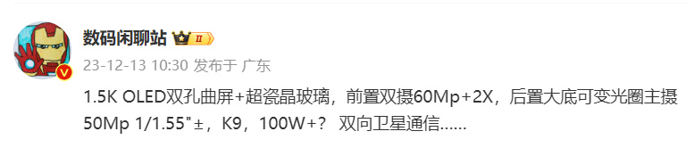该博主透露,这款新机配备 1.5K OLED 双孔曲屏 + 超瓷晶玻璃,前置双摄为 60Mp+2X 变焦,后置大底可变光圈主摄 50Mp 1/1.55"±,支持双向卫星通信。该博主还提供了一个“K9”信息,网友推测其与麒麟芯片有关。