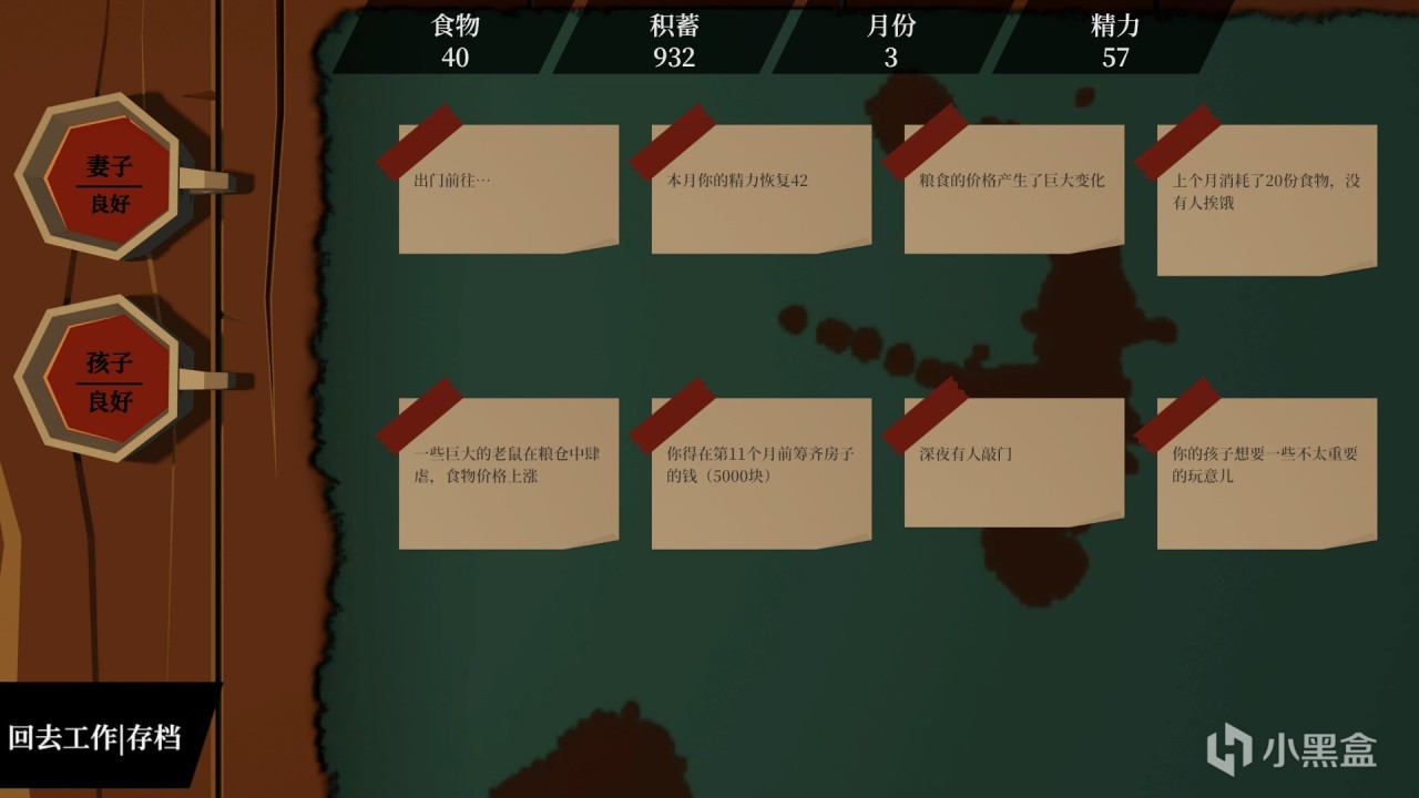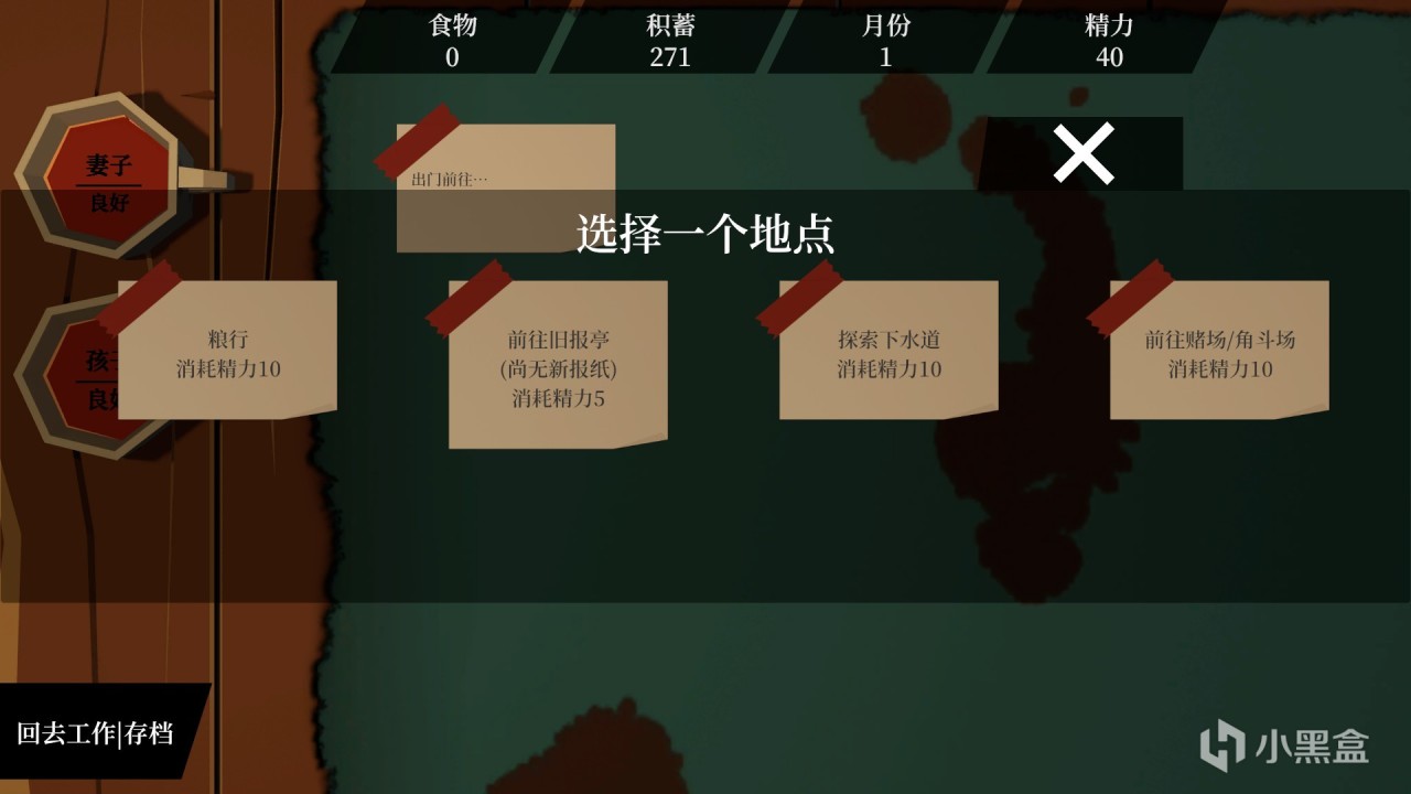 结束本月工作之后你会休假回家,游戏中以水杯来显示妻子和孩子的状态,用便签来呈现你可以互动和需要处理的事情,比如孩子生病,家中没有食物,姑妈离世你需要凑够钱来购买居住的房屋否则就会无家可归。你可以出门前往粮行、旧报亭、寻找黑市以及前往赌场角斗场,之后还可以在地下闲逛,这些选项都需要花费精力,黑市可以通过提高酒馆老板的好感而直接获得前往路线,不用因为迷路碰到熊孩子了。