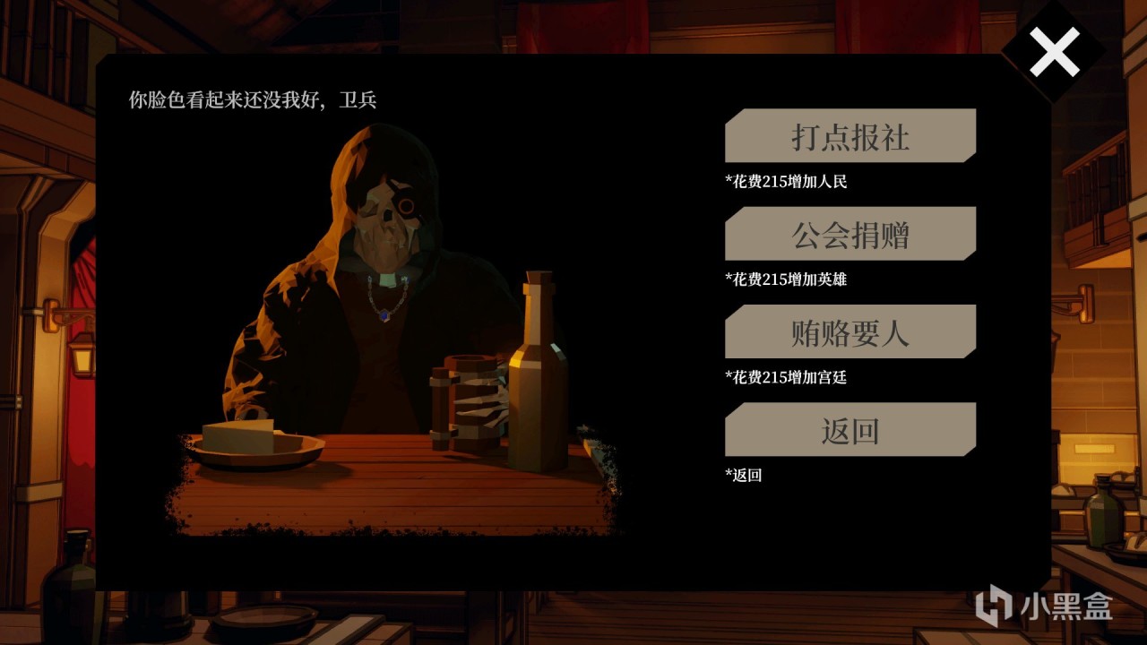 掮客可以维护社会关系,请英雄离开,好感提高后还可以借贷,可以通过请喝酒来提高NPC好感,不同NPC喜欢的酒不同,比如酒馆老板就喜欢喝葡萄酒,装备商就喜欢果酒,好感度会比其他酒增加2点。