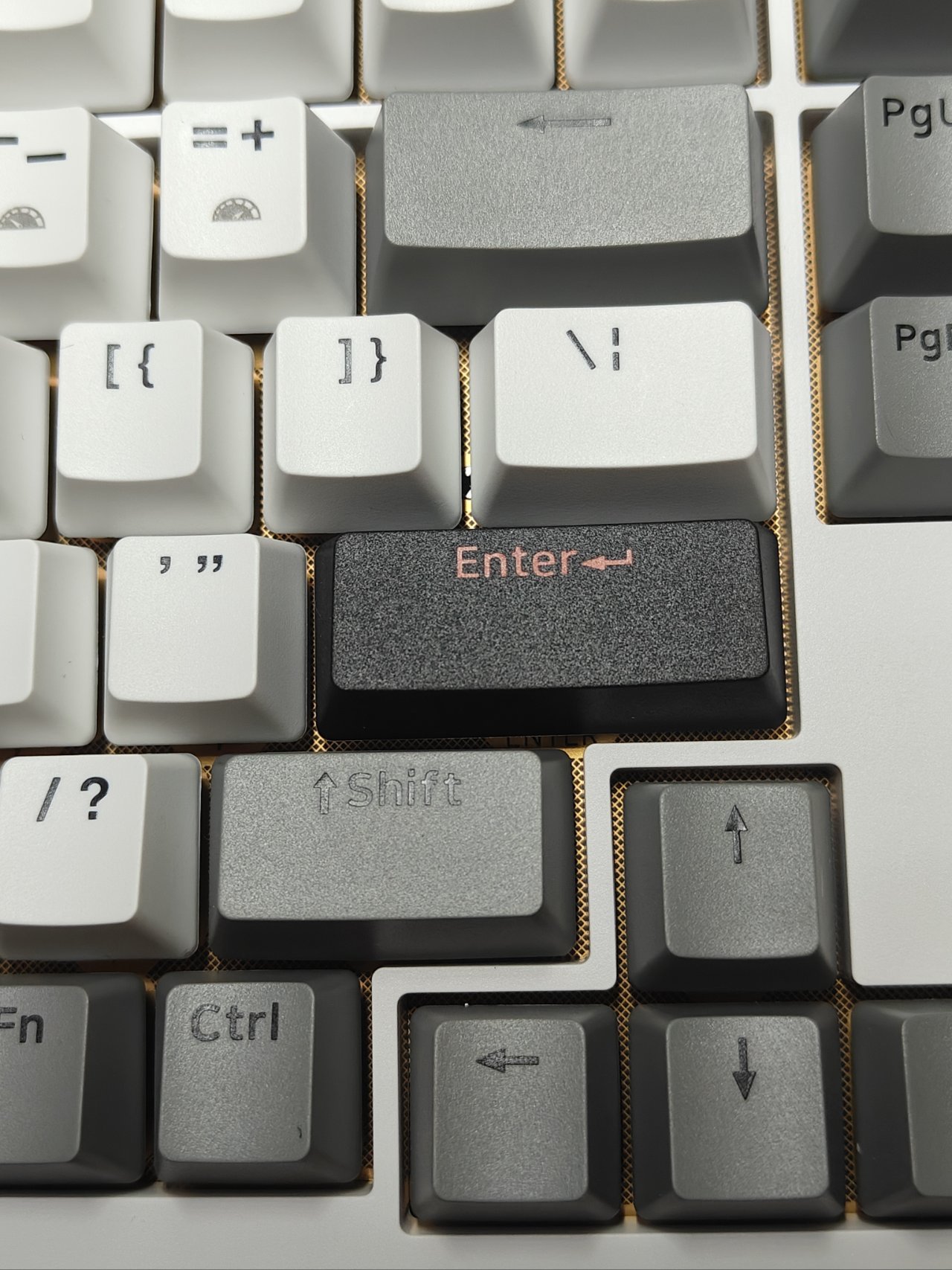 键盘采用了复古打字机的黑白配风格设计,内部有黄色的定位板,隐隐发亮的感觉还蛮不错。