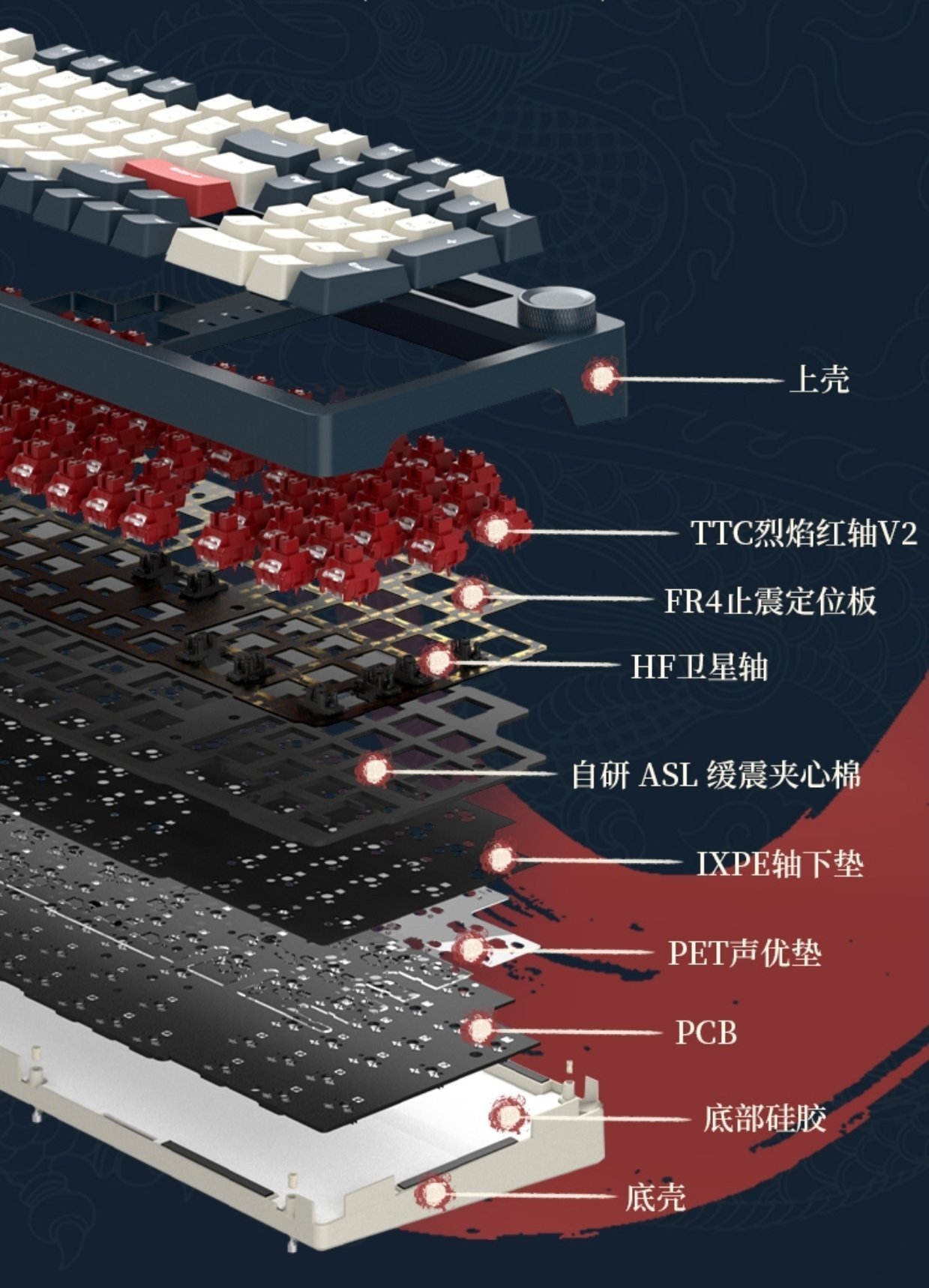 红色派系的配色有一种中国红的感觉,众所周知,TTC是国内数一数二的轴体厂商,他们的轴体按压寿命更是达到惊人的1亿次。