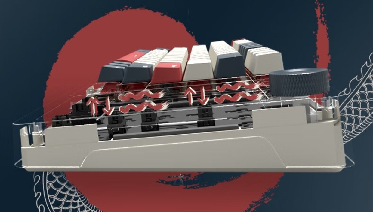 使定位板依靠高性能支撑回弹材料悬浮在键盘内部,并提供弹性缓冲行程,将敲击震动通过结构形变吸收从根本上解决高频震动抑制问题。