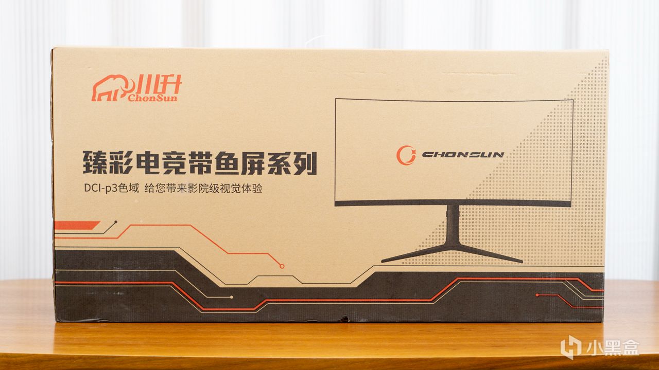 這是川升顯示器CS385F的外箱,電競、帶魚屏、廣色域等一目瞭然,相較於以前,如今的包裝也更具設計感。