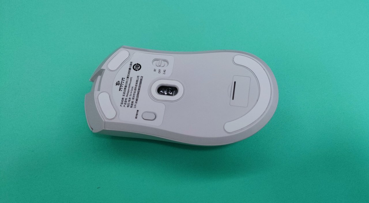 将目光移向鼠标的底部,你可以看到左侧的蓝牙配对键,,右侧的模式切换开关以及最底下的2.4G收纳仓,值得注意的是,这款鼠标已经为使用者贴好了PTFE脚贴,所以请勿将其撕下,所以这款鼠标是可以到手即用的。