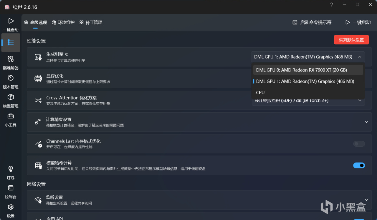 在使用过程之前,还需要一些小设置,首先是引擎选到GPU上,现在AMD可以直接使用DirectML进行AI图像生成,选自己的显卡即可。显存优化根据自己显卡的显存来判断,一般选择8G优化会比较快,其他的就不用更改,一键启动即可开始AI绘画
