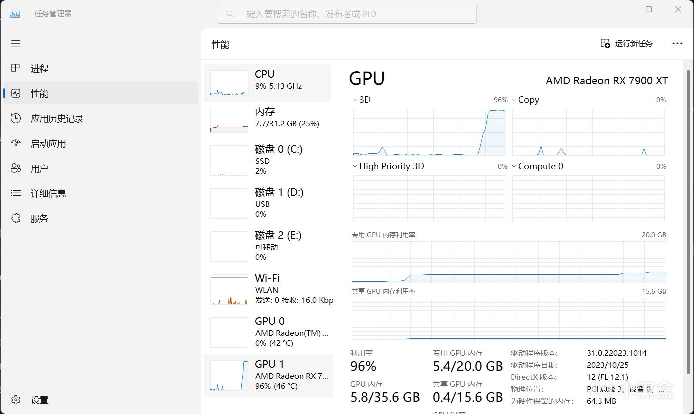 可以看到生成过程中,显卡实际上使用最多就是自己的张量核心,不过可惜的是目前DirectML并不能获取满血的性能,需要更高性能的话需要Olive或者使用linux