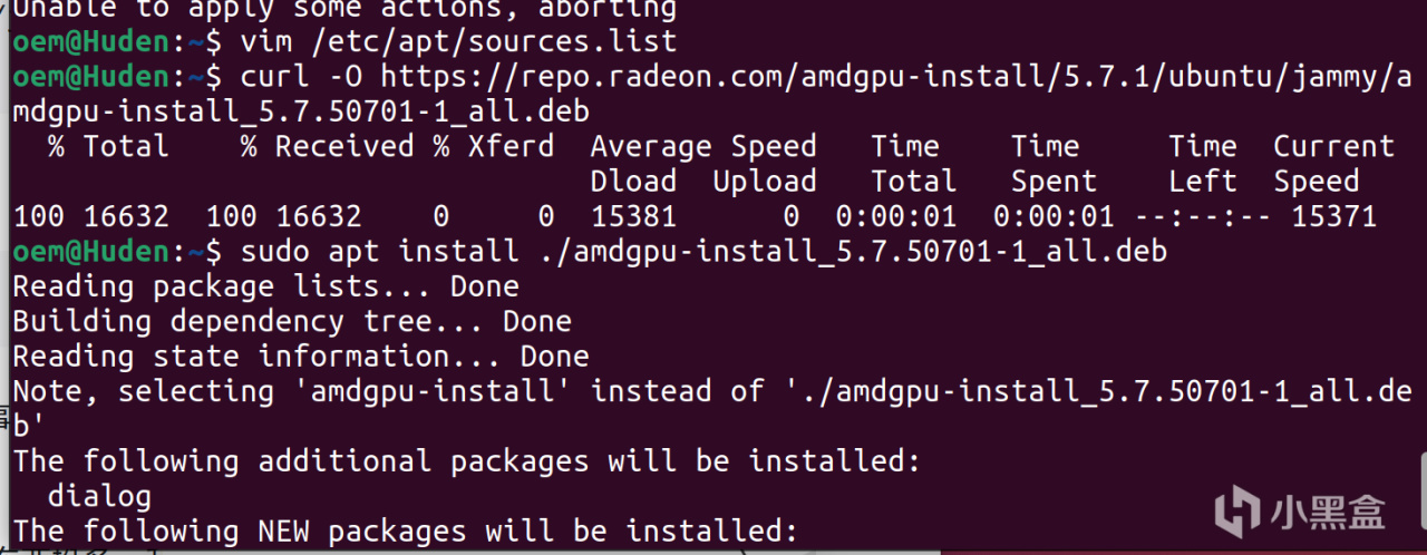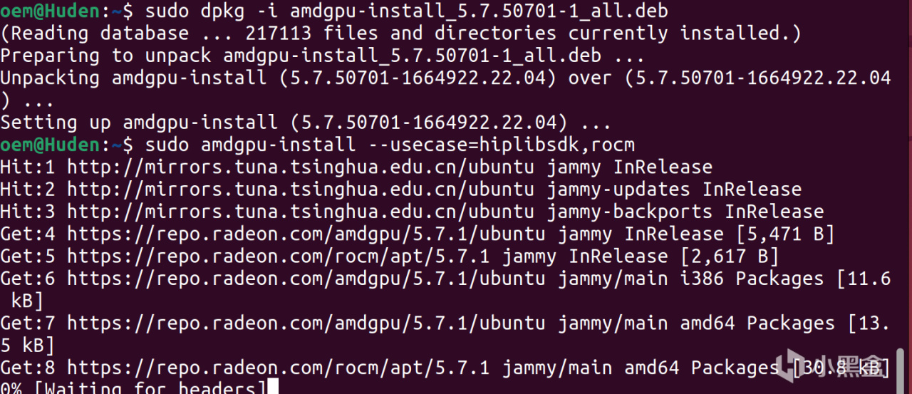 按照AMD官方的指引一步一步地安装ROCm,一般来说使用AMDgpudkms是最方便的安装方法,我这里推荐使用5.7版本的ROCm,使用官方的dkms来安装管理这个系统。分步执行下面这些命令,即可安装ROCm。这些包非常大,所以建议耐心等待或者使用更流畅的网络