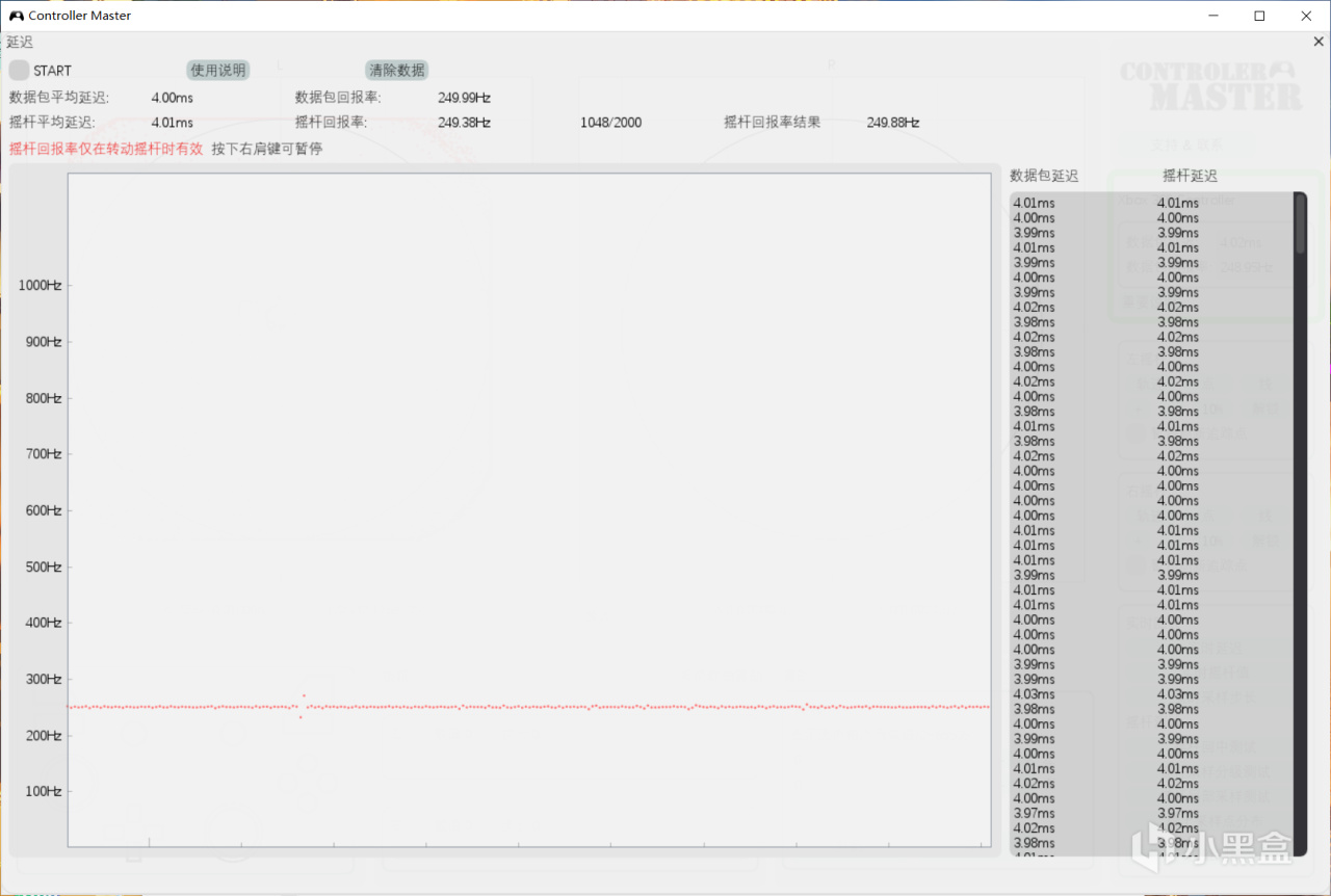 目前随着玩家们对回报率的要求较高,厂家们也开始对这方面进行升级,从最基础的125hz一直到1000hz回报率都有很多手柄在做,而启明星虽然价格相对来说快触底了,但回报率方面并没有妥协,经过软件测试可以看到整体的回报率都达到了250hz,同时整体的稳定性也非常不错,可以看到基本使一条直线,在目前国产手柄中算相对优秀的了。