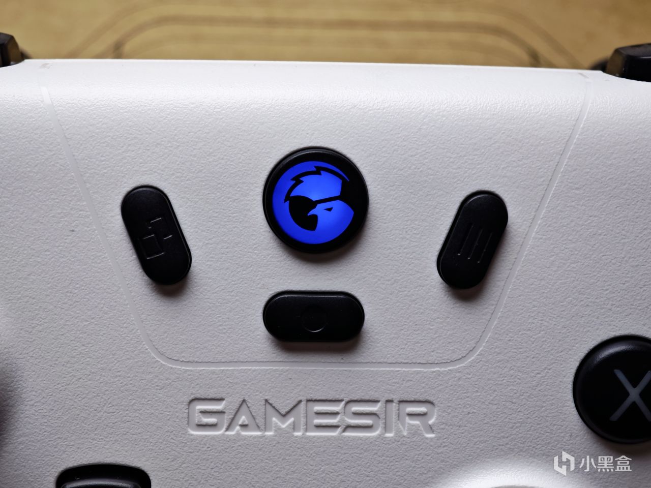 顶部可以看到配有四个按键,除了常见的MENU和START键之外剩下的一个是小鸡的LOGO键,另一个则是截图键,LOGO键的功能想必大家都很熟悉了,我一般都是用它一键打开steam的,同时这也是这款手柄上唯一能亮起来的地方,也起到了指示灯的作用。