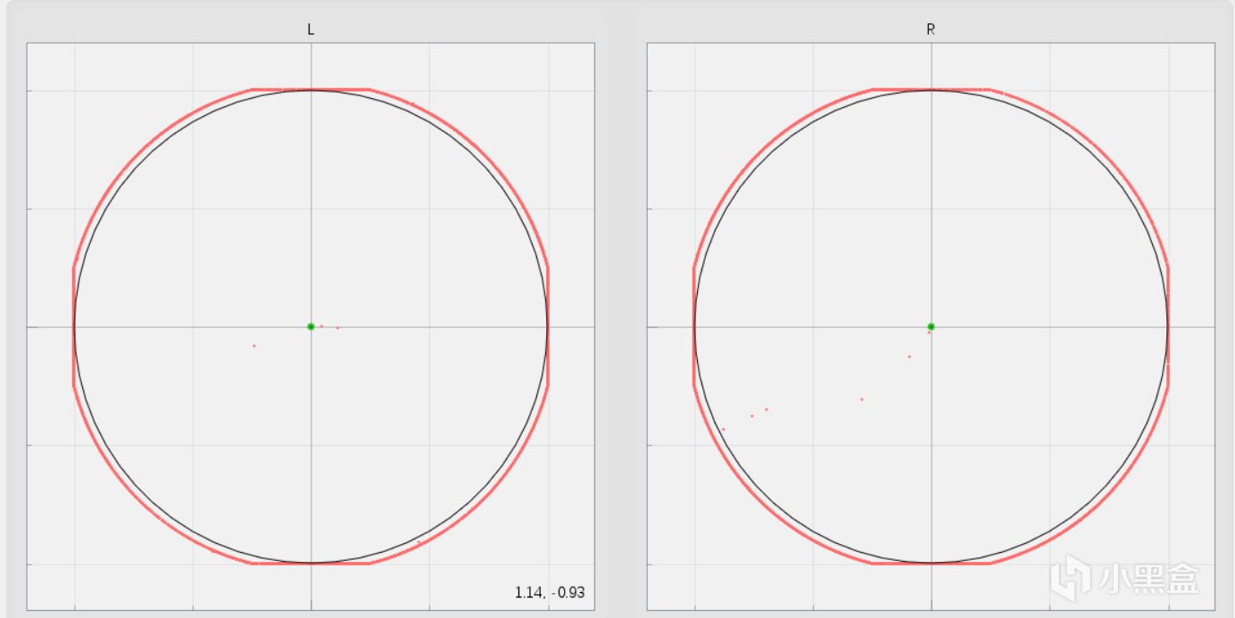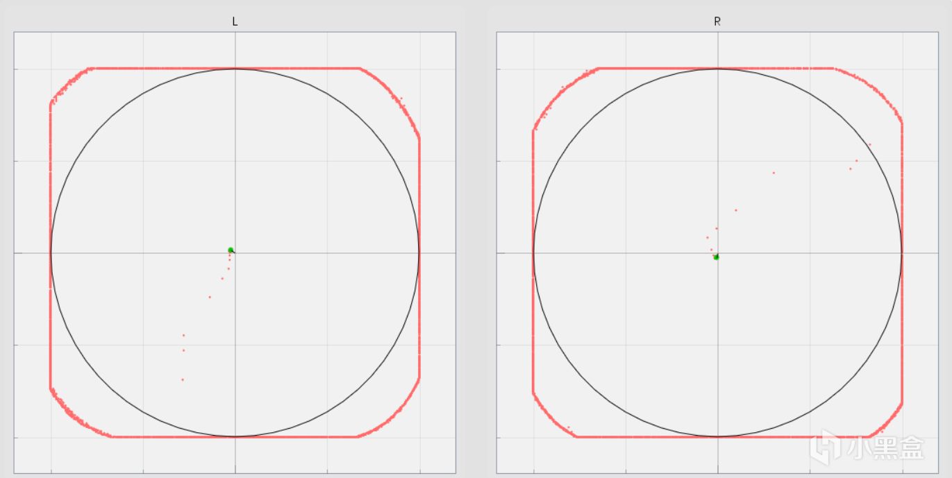 实际测试中可以看到摇杆有两种模式,一种是默认的圆形轨迹,在这个模式中摇杆中心点带有较大的死区,也被称为中心死区,这个模式下适合玩一点较为休闲的游戏,对摇杆精度要求不那么大的像《双人成行》这种。