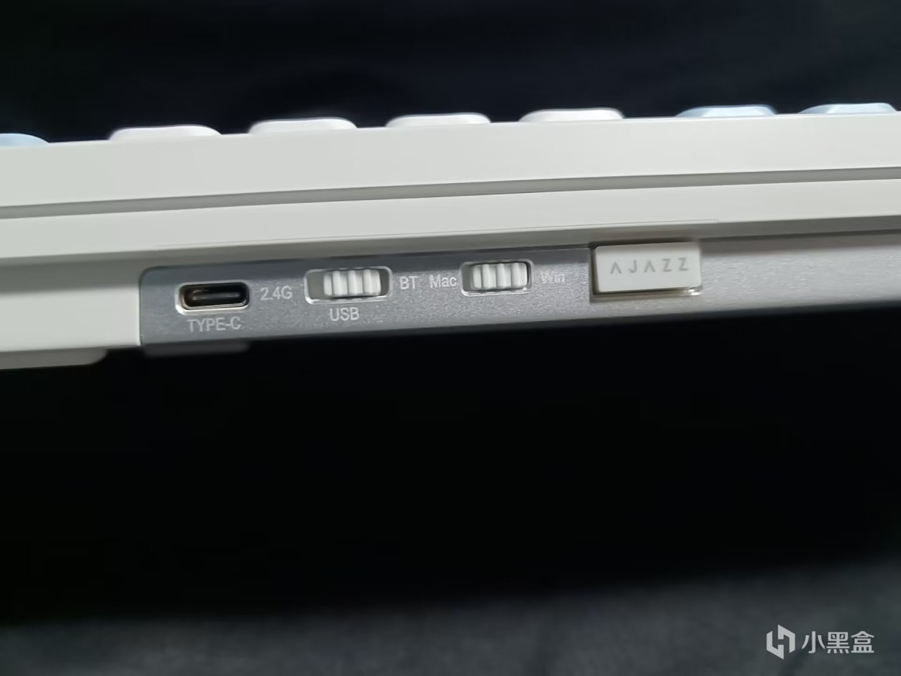后侧方左边就是用来连接的Type-C接口,右边是切换连接方式的拨杆开关和切换适配系统的拨杆开关,旁边是2.4g接收器收纳仓。