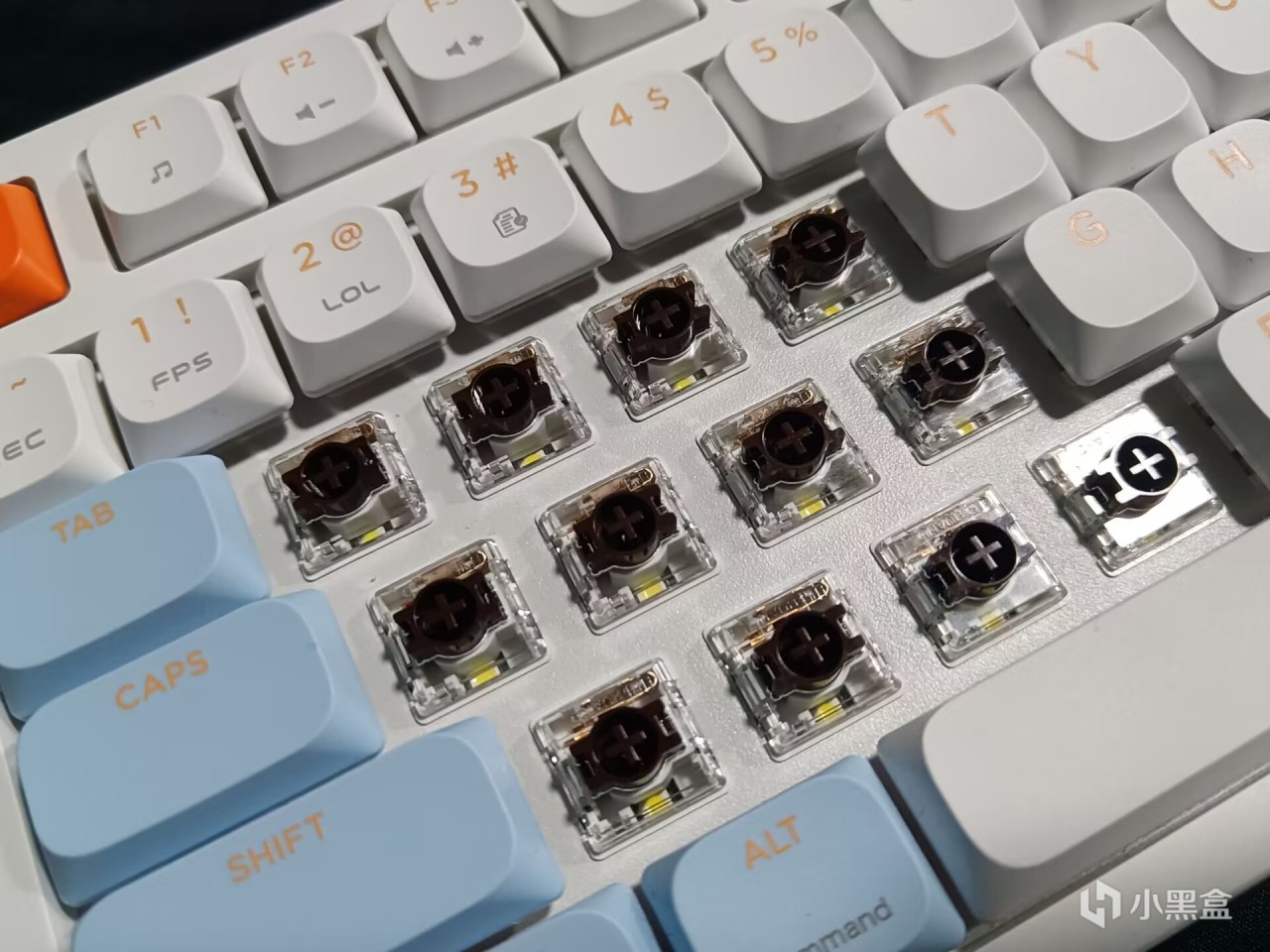 轴体这方面我选择的是高特矮茶轴,跟常规轴体相比,最大的区别就是键程方面,矮茶轴触发行程1.5mm,触发压力42g,触底压力55g,然后因为这款键盘是焊接固定轴,并且都是基础轴体,所以具体的就不说了。