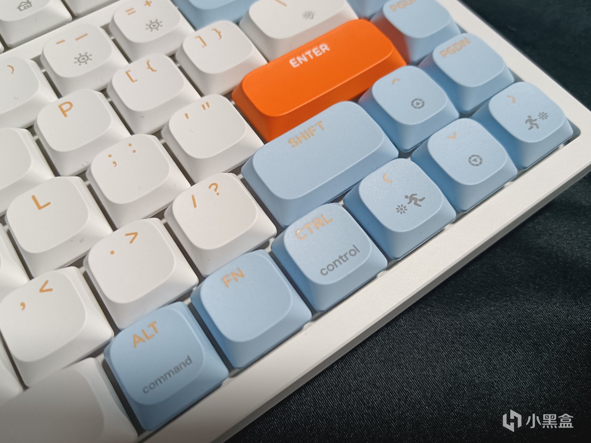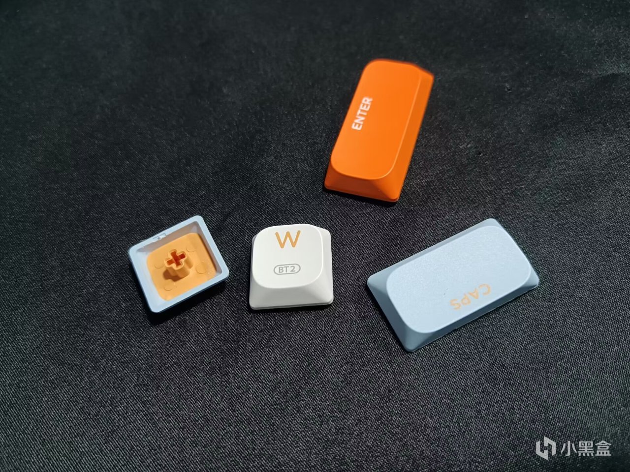 键帽方面经典三拼配色,采用PBT材质,不易打油,双色注塑工艺,字符不易磨损,然后就是键帽的菊花,因为这款键盘搭载的轴体是十字轴心,所以键帽菊花也是十字的,这也就意味着咱们常规的键帽是可以上的,我自己实测下来发现虽然卡的不够紧,但是可以正常使用。