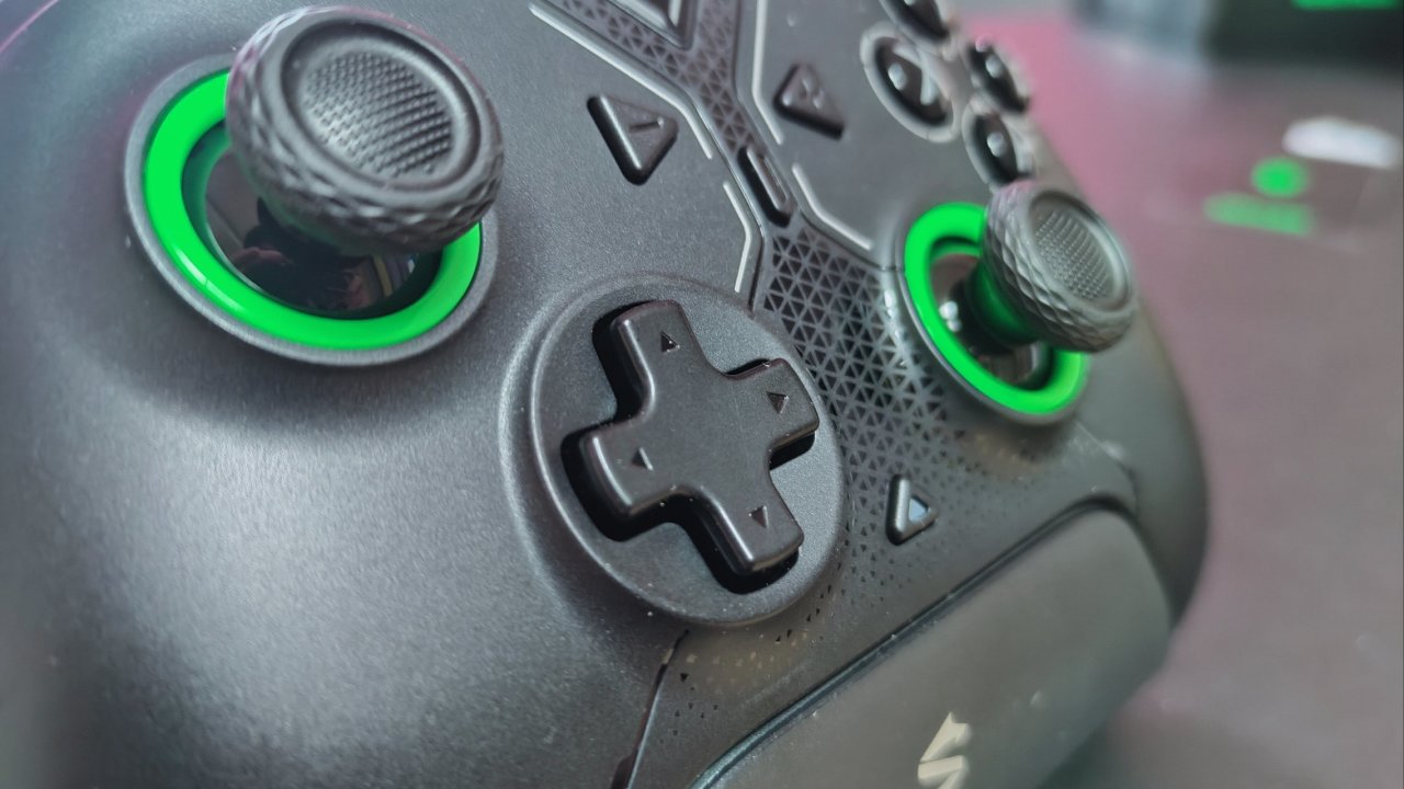 外观上以黑色为主体,以绿色作为点缀,手柄两侧还有pom环来保护摇杆,手柄的按键和十字键方面均采用导电胶,手感方面较为不错,并且也不容易串键