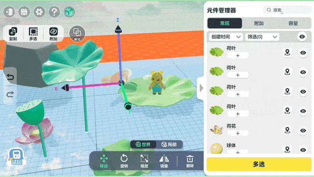 其次,「造梦空间」通过深入浅出的创作指引、持续的优化操作,以及增加更多的辅助功能,来降低用户的创作门槛。其中,【元件管理器】可以对场景中的所有元件进行管理,包括搜索、筛选、批量编辑;【智能辅助配色】可以根据主题更换地图配色;点击【元件镜像】,则快速生成对称模组;点击【碰撞预览】,则进入可视化编辑状态,能快速查出不和谐的元件。