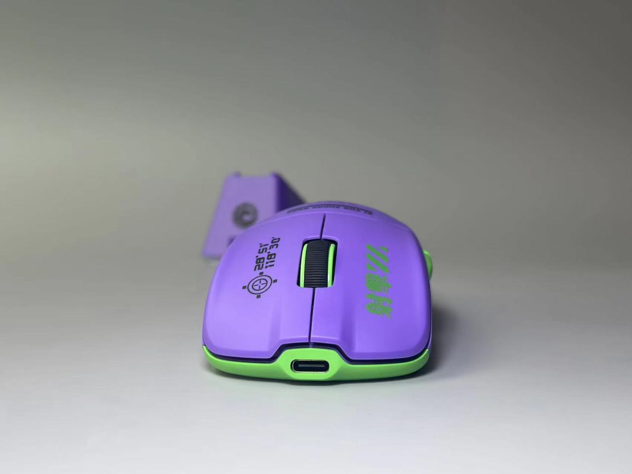 VKm1的尺寸爲119.5X62X40mm大小上來看更多的是偏向於小手玩家的。鼠標整體用了黑紫綠三拼色,且非常多的工業設計。