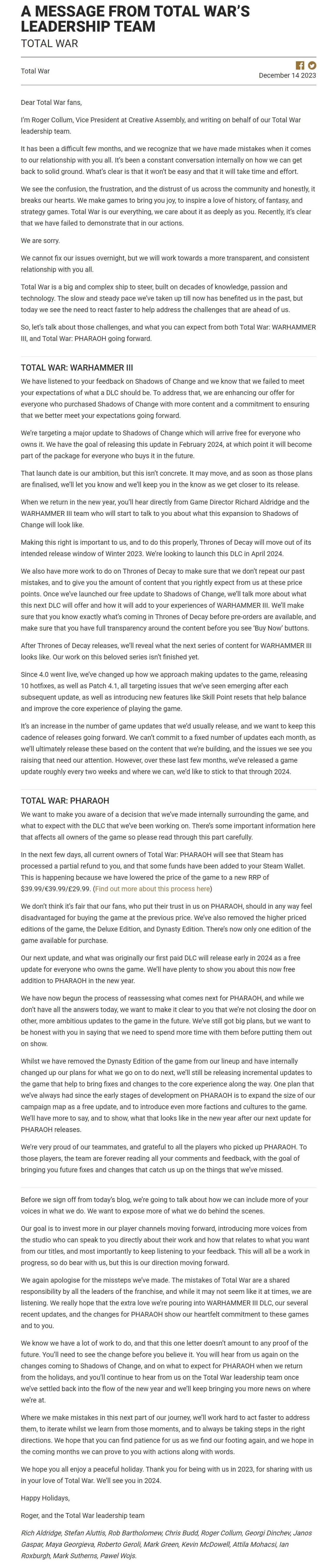 爲此,CA表示決定將《全面戰爭:法老》價格永降(國區售價從289元降至179元),已購入的玩家會退還差價,並且2024年初的首個DLC將以免費的形式推出。此外,遊戲的豪華版、王朝版等高價版本已被刪除,現在遊戲只有一個版本可供購買。