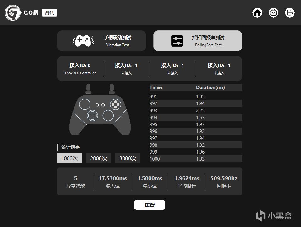 2、摇杆回报率为509hz,错误率为千分之五,勉强可以接受。