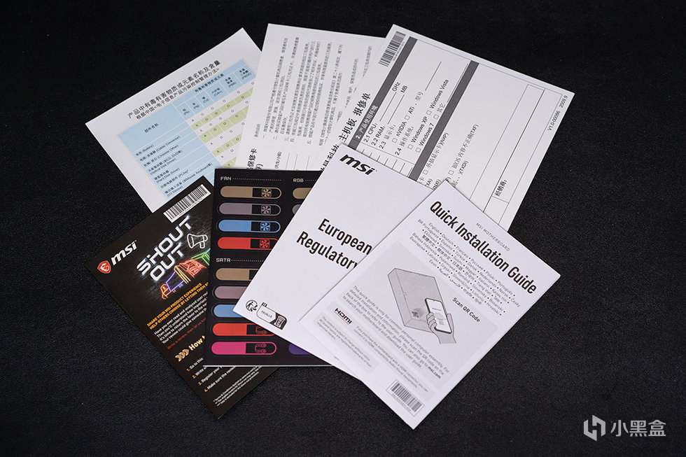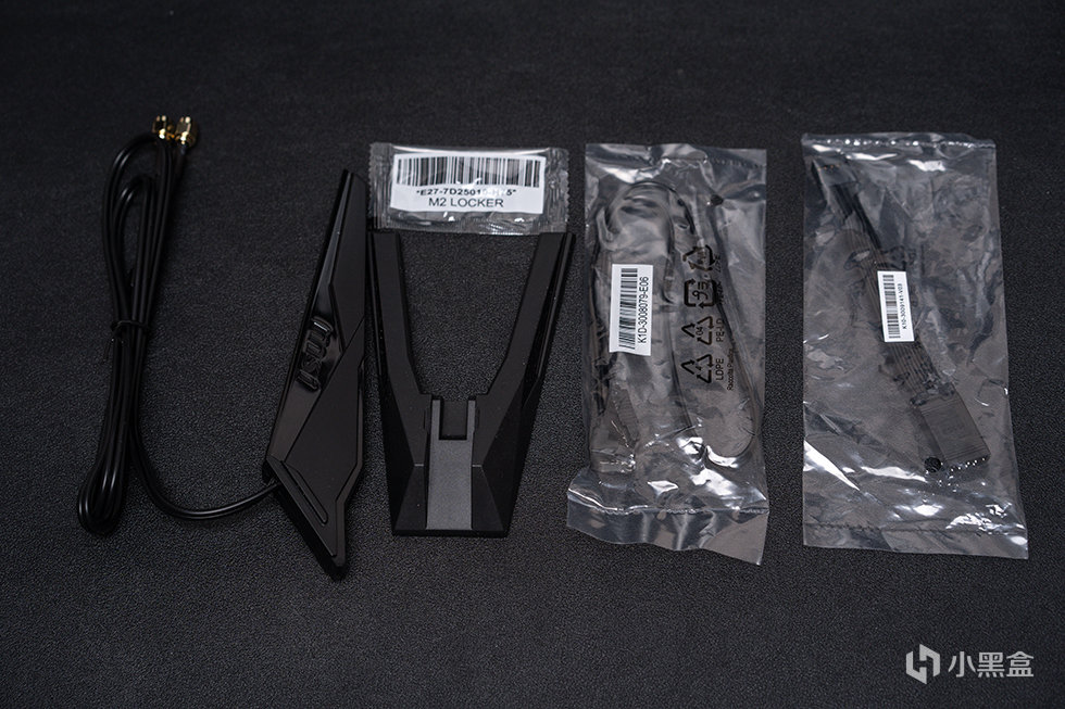 配件方面包含了WiFi天线、SATA数据线、IO面板连接线、M.2硬盘快拆螺丝以及一系列保修卡、贴纸、说明书等纸质说明。