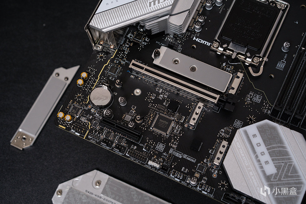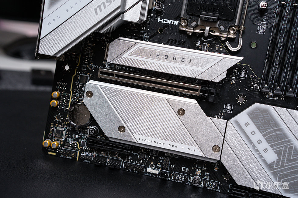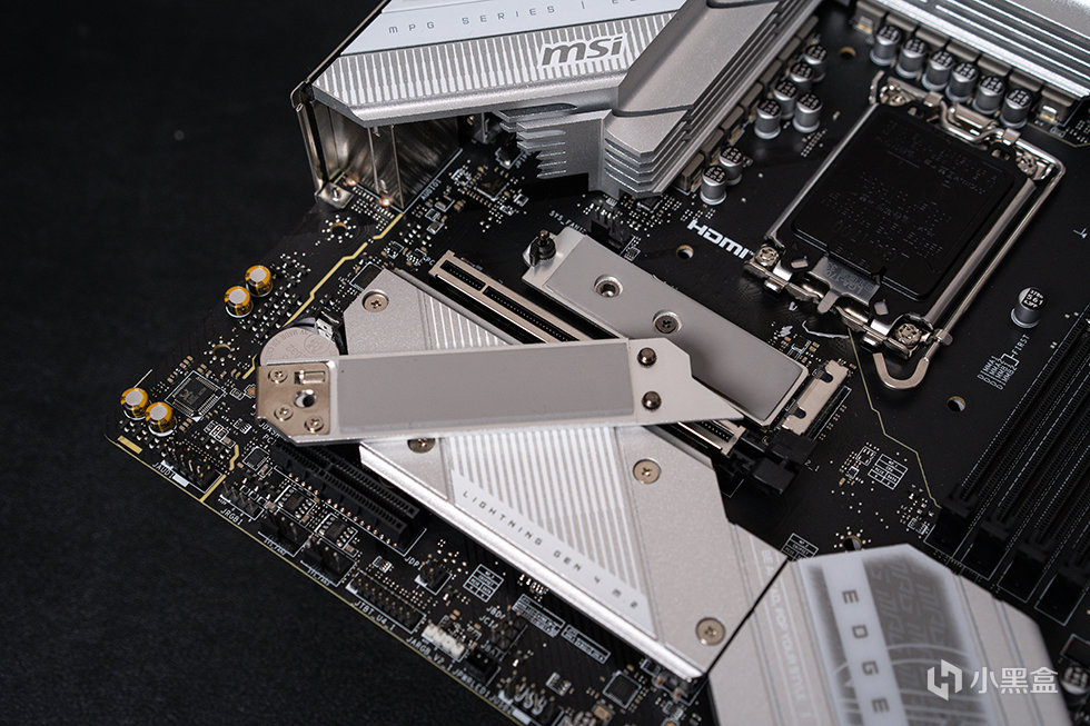 微星MPG B760M EDGE TI WIFI主板提供了3个支持PCIe 4.0 x4传输协议的M.2槽位,一般的MATX主板都之提供2个M.2槽位,更多的槽位能满足大存储用户的需求。最上面的M.2_1槽由CPU直连通道提供,提供64Gbps带宽。M.2_1槽位配备独有的 SCREWLESS M.2 SHIELD FROZR 免工具快拆散热装甲,上面印有EDGE MAX 和 LIGHTING GEN 5 M.2 字样。移除快拆散热装甲可以看待底部还有一片金属背板用于辅助散热。