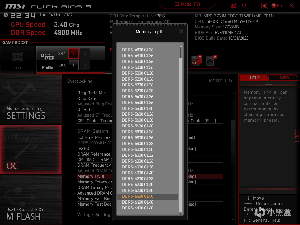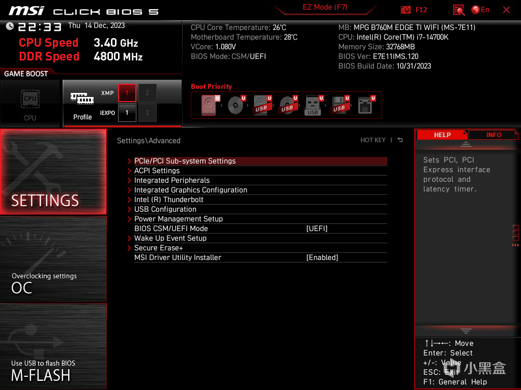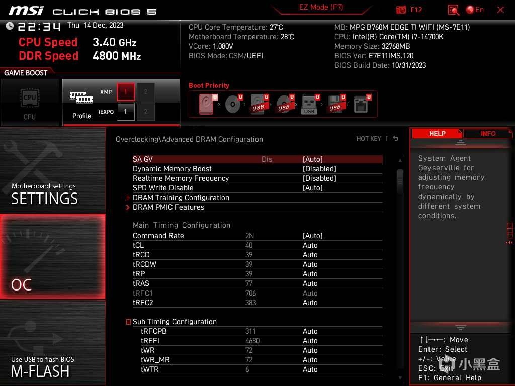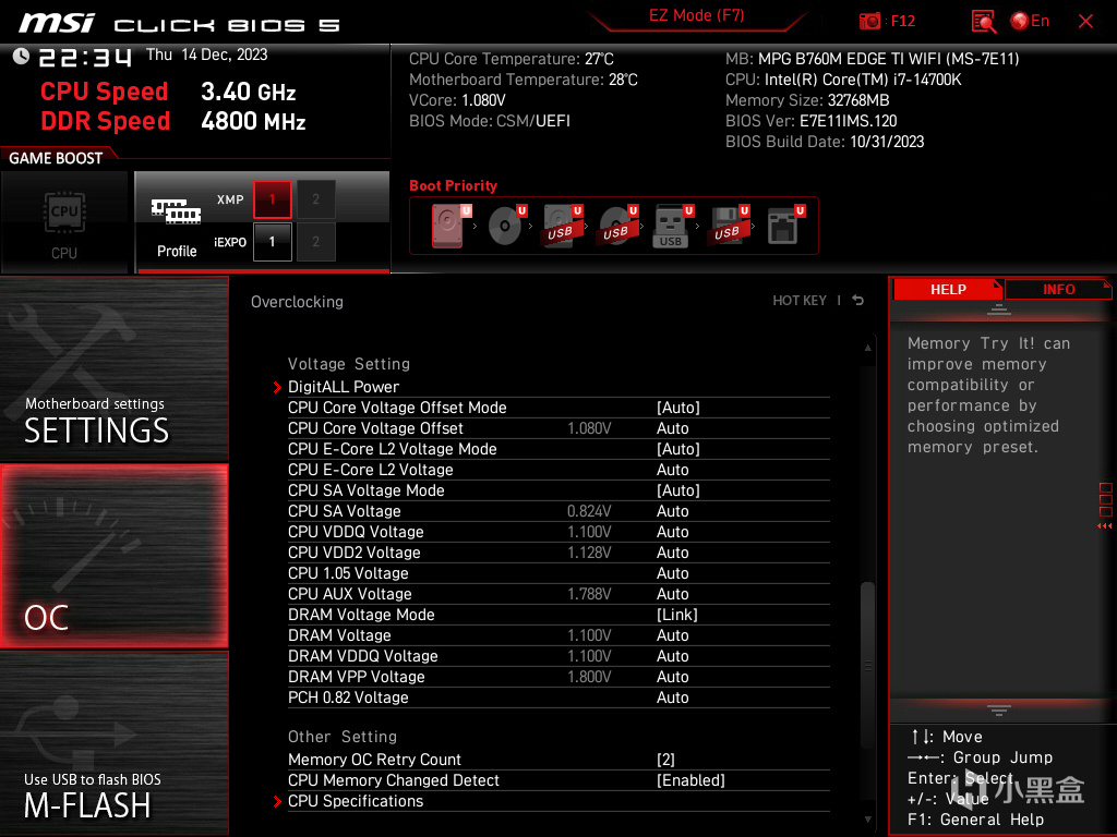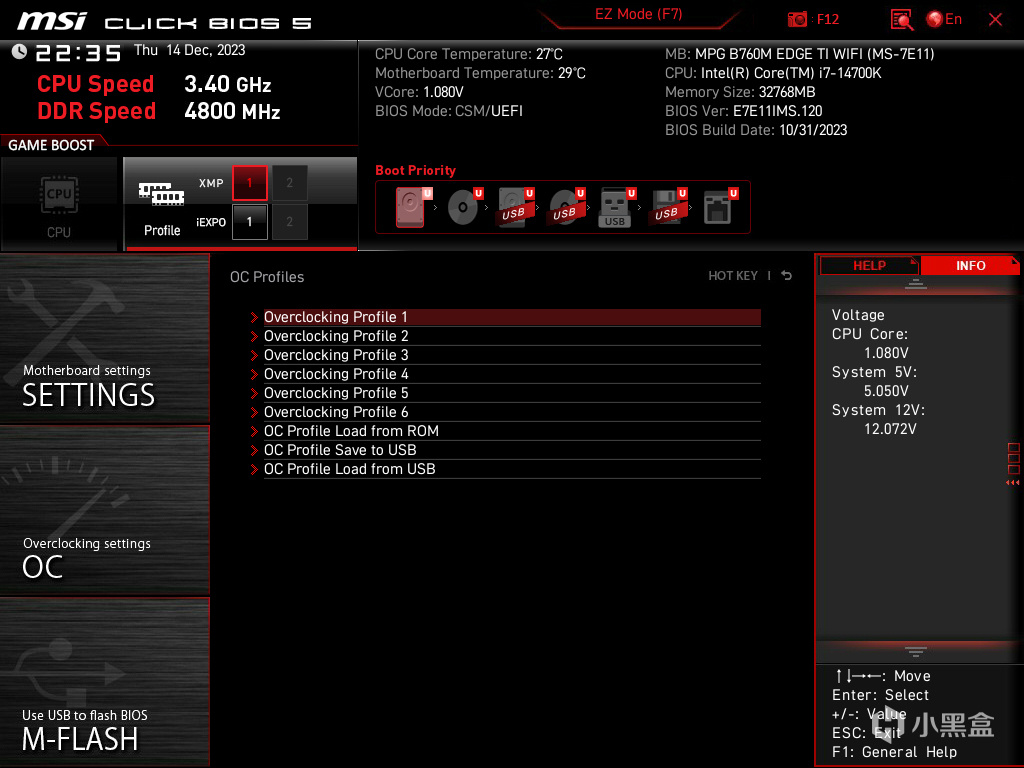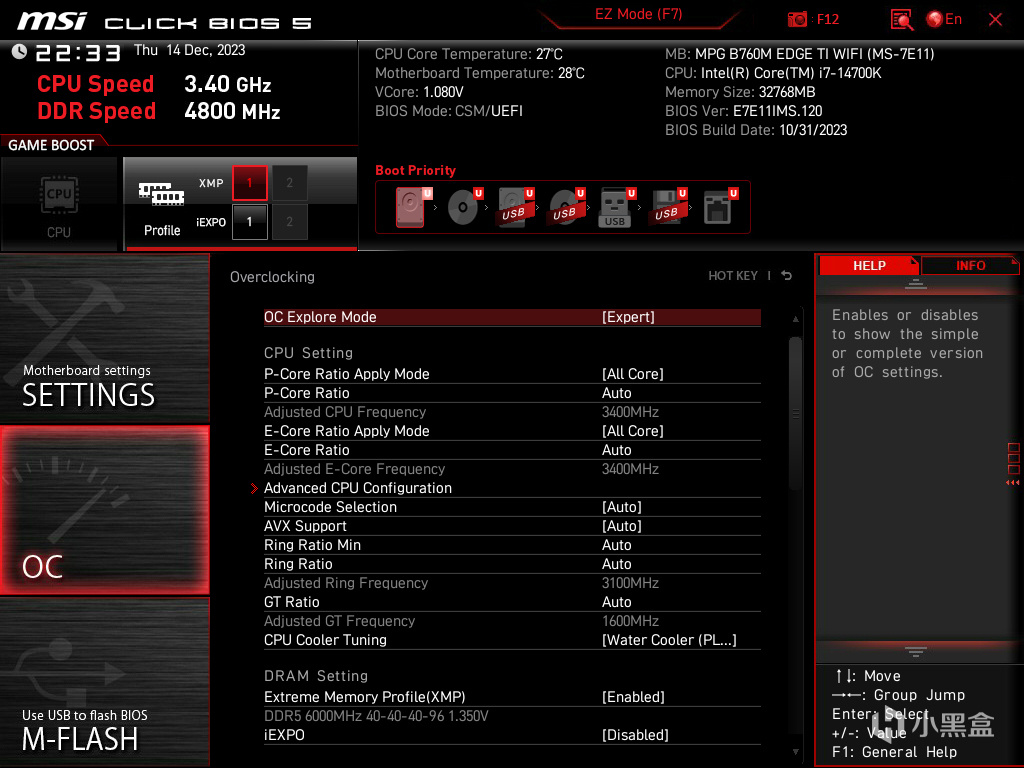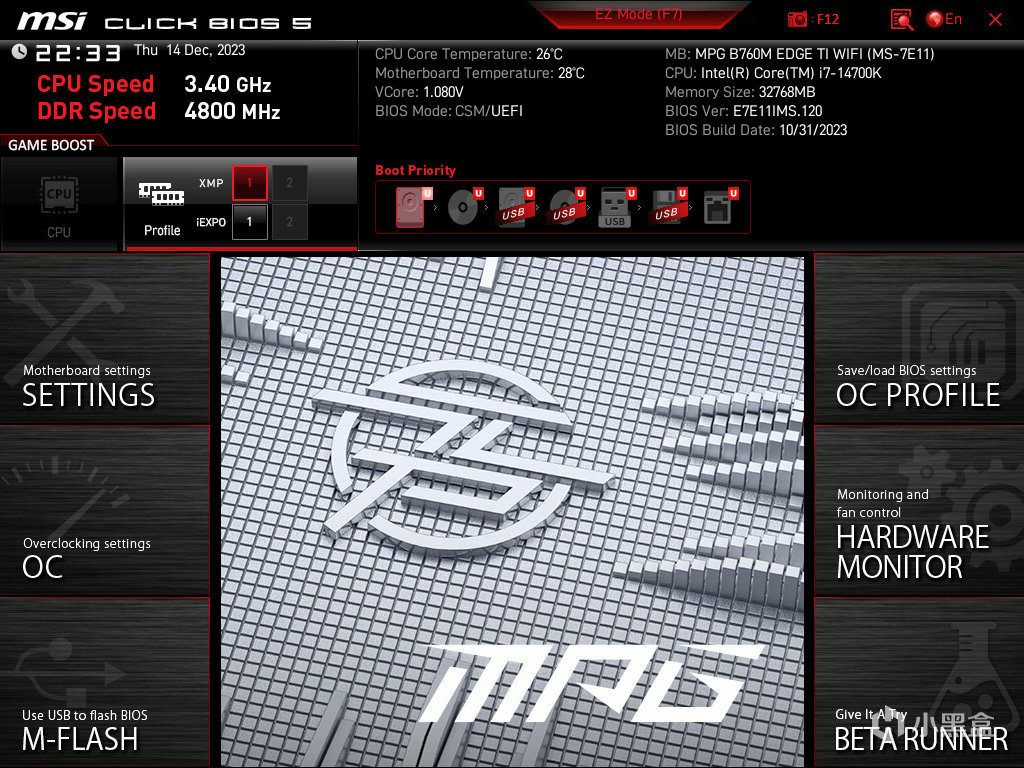 微星MPG B760M EDGE TI WIFI主板的BIOS默认是CLICK BIOS5的简易模式界面,对于大部分用户常用的BIOS功能设置都可以在这个界面方便的找到,比如启动顺序、CPU一键超频、内存打开XMP等 。