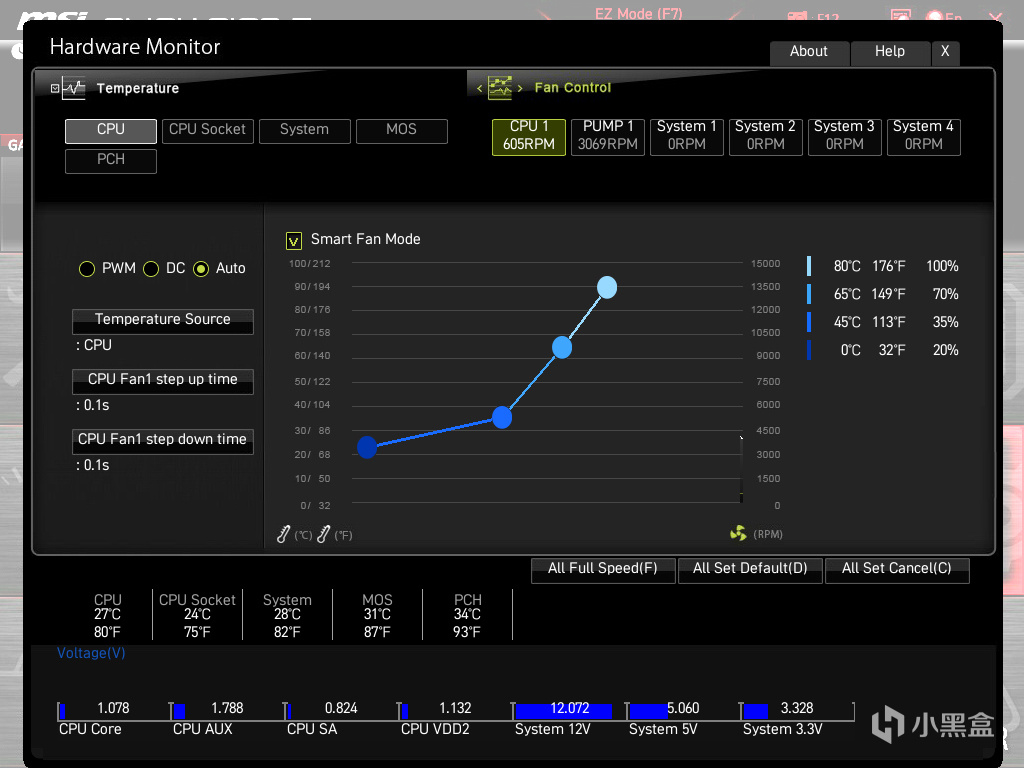 硬件监视菜单选项:系统温度监控,并可对所有风扇进行单独设定转速。