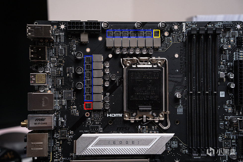 移除散热装甲,详细的供电配置一览:蓝色标注区域为12相CPU核心供电,每相配有一个75A的DrMos RAA 220075R0,黄色标注区域为1相核显供电,DrMos同样为75A的RAA 220075R0。红色区域标注为1相AUX供电,DrMos为MPS MP87670,最大电流为80A。绿色标注区域为PWM芯片 RAA229132。