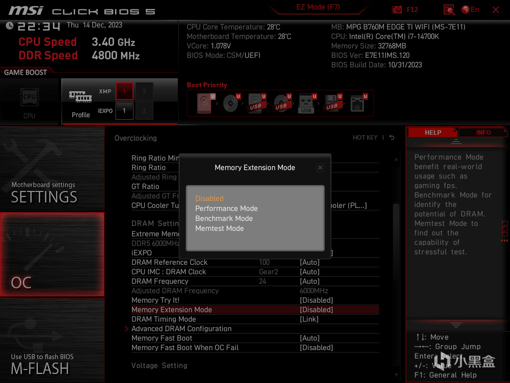 众所周知,微星的BIOS对内存超频还是很用心的,除了对小白用户非常友好的Memory Try It ! 功能以外,还增加了Memory Extension Mode功能,该功能可以优化内存参数,提升内存性能。一共有三种预设模式可供选择:Performance Mode、Benchmark Mode和 Memtest Mode基准模式和内存测试模式。