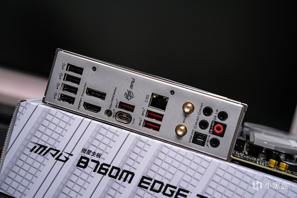 微星MPG B760M EDGE TI WIFI主板采用一体化背板设计,提供了1组4个USB2.0,1个HDMI 2.1显示输出接口、1个DP 1.4显示输出接口、Clear CMOS按键、3个USB 3.2 Gen 2 10Gbps Type-A(红色)、1个USB 3.2 Gen 2x2 20Gbps Type-C、2.5G网络接口、Wi-Fi / Bluetooth天线接口,以及音频接口。