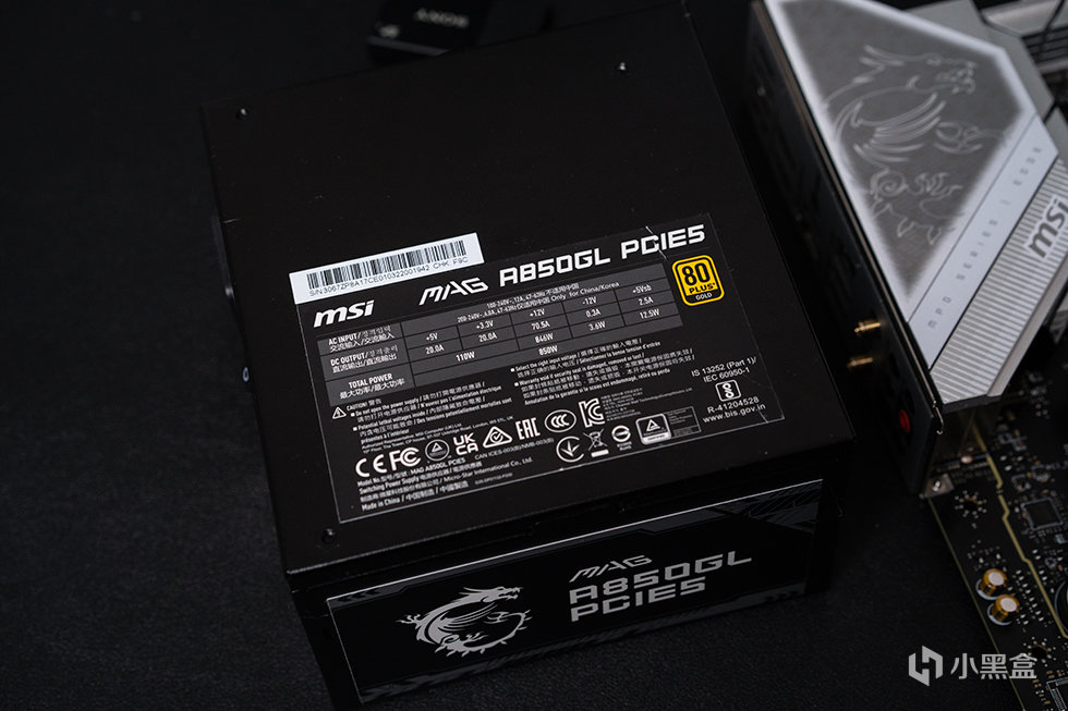 为了保证整机的稳定运行,电源方面选用微星MAG A850GL PCIE5 电源,支持ATX3.0标准,原生PCI-E 5.0 ,通过80 Plus 金牌认证,提供7年质保。采用DC-DC电路加全桥LLC谐振的方案,最大输出功率为850W。采用全模组设计,配备了原生 PCI-E 5.0 输出接口,支持 Intel PSDG(电源设计指导规范)ATX 3.0 标准,可承受高达两倍整机功耗和三倍显卡功耗的峰值功率。