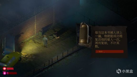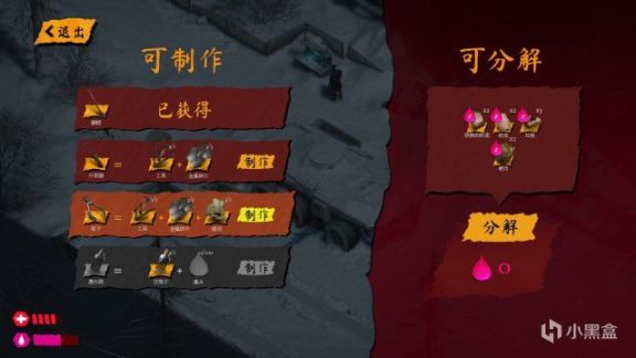 然後遊戲中可以撿到3類物品:零件可以合成工具——撬棍、開鎖器和鑷子,來破壞容器,破壞的容易99%是裝着零件還有可分解物品,可分解物品分解出100墨水+1個瓶子可以合成一瓶藍藥,血藥則只有蘋果(回1血)、發黴麪包(回2血),第4本書石中劍有回5血的醫療包(上限5血)但基本用不到。然後最後的終章基本就是戰個痛,可以imba技能三選一,還可以無限復活,等於就是給你看個劇情了。